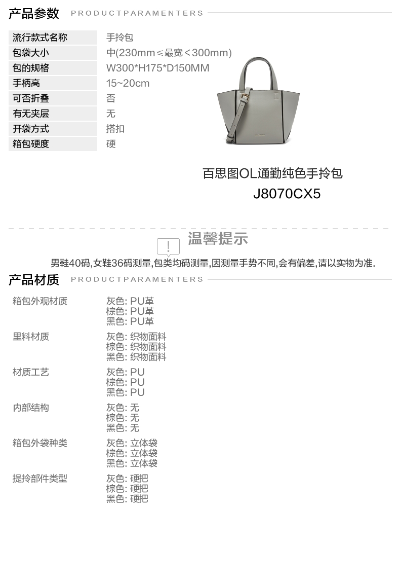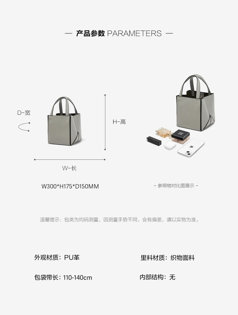 | 包的规格:W300*H175*D150MM | 内部结构:无 | 背带方式:单肩/斜挎 | 风格:OL通勤 | 色系:灰色 |