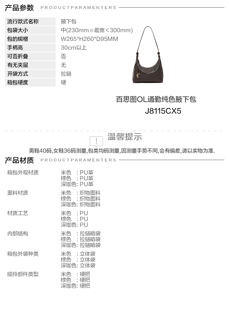 | 包的规格:W265*H260*D95MM | 内部结构:拉链暗袋 | 背带方式:单肩 | 风格:OL通勤 | 色系:咖啡色 |