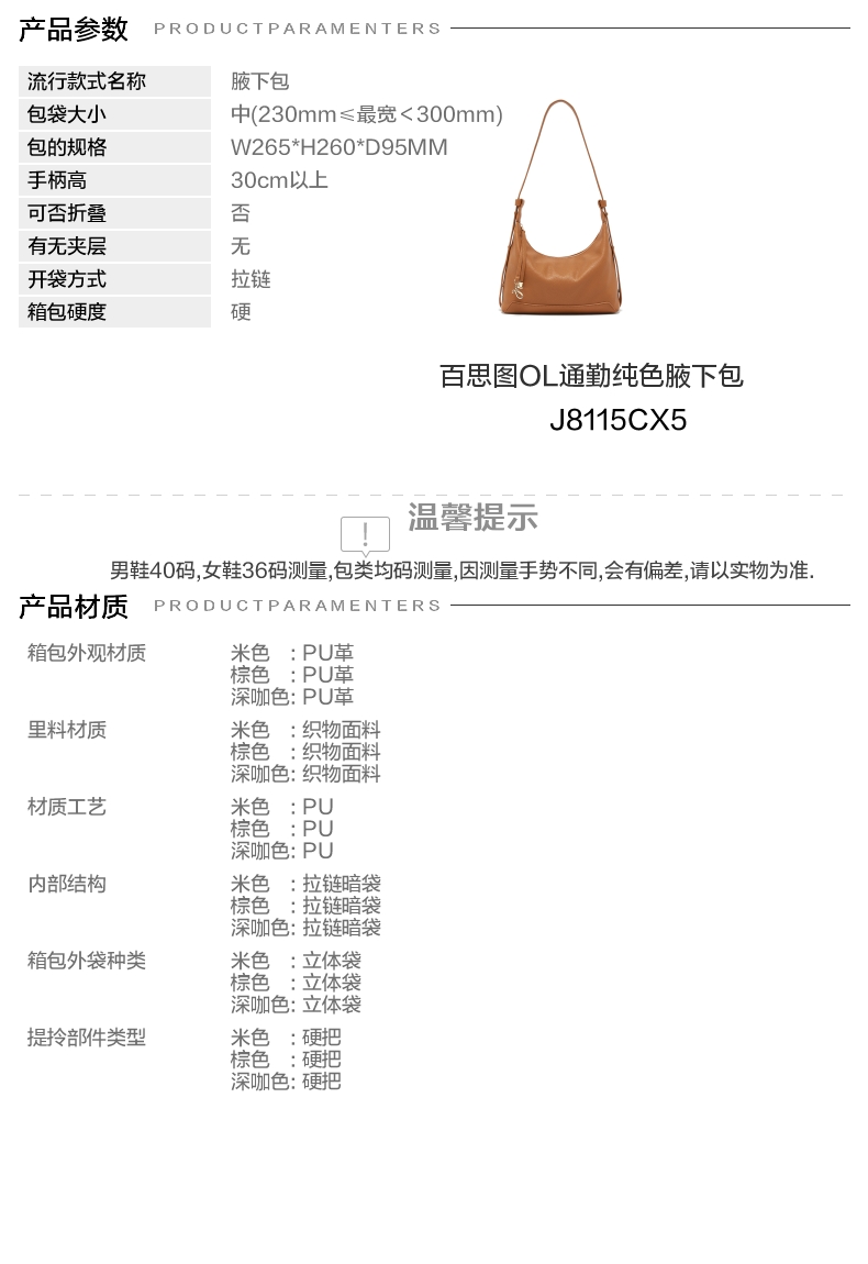 | 包的规格:W265*H260*D95MM | 内部结构:拉链暗袋 | 背带方式:单肩 | 风格:OL通勤 | 色系:棕色 |