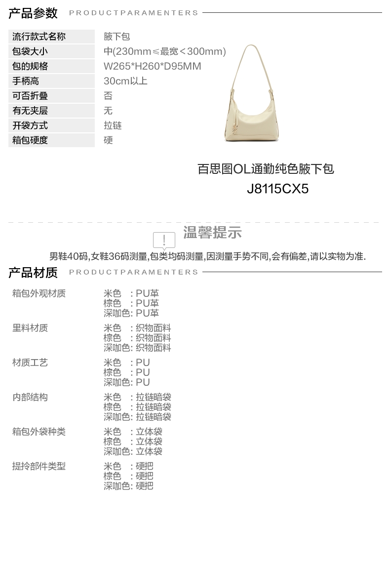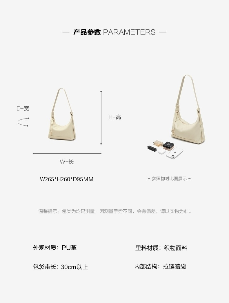 | 包的规格:W265*H260*D95MM | 内部结构:拉链暗袋 | 背带方式:单肩 | 风格:OL通勤 | 色系:米色 |