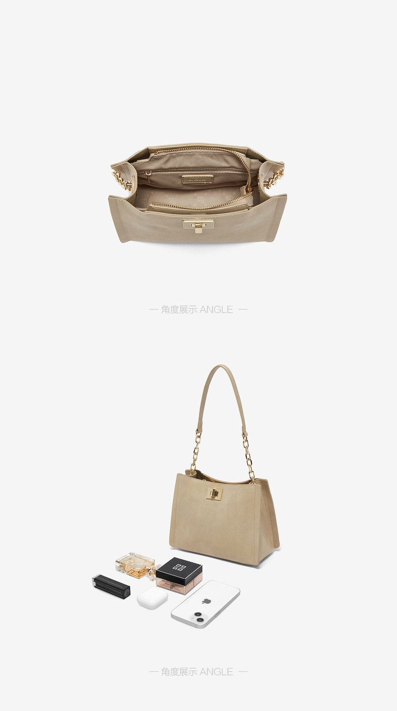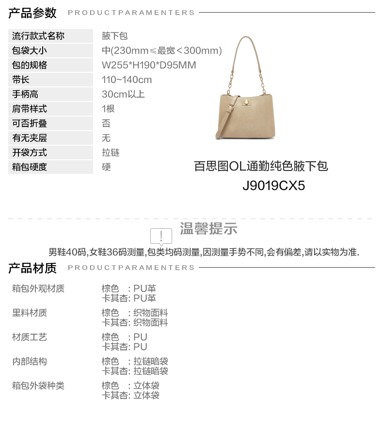 | 包的规格:W255*H190*D95MM | 闭合方式:拉链 | 背带方式:单肩 | 内部结构:拉链暗袋 | 风格:OL通勤 |
