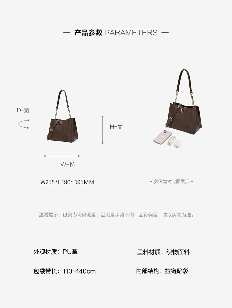 | 色系:咖啡色 | 适用场景:通勤 | 开袋方式:拉链 | 性别:女子 | 手柄高:30cm以上 |