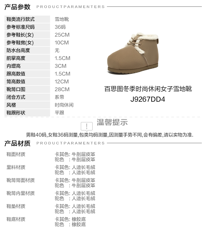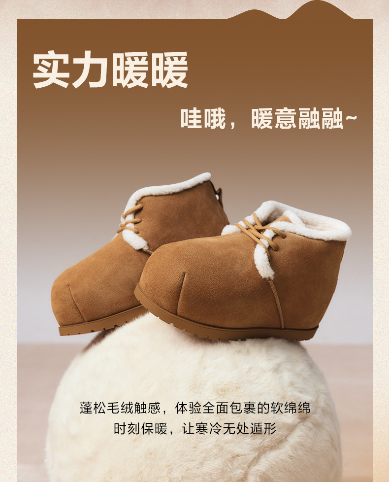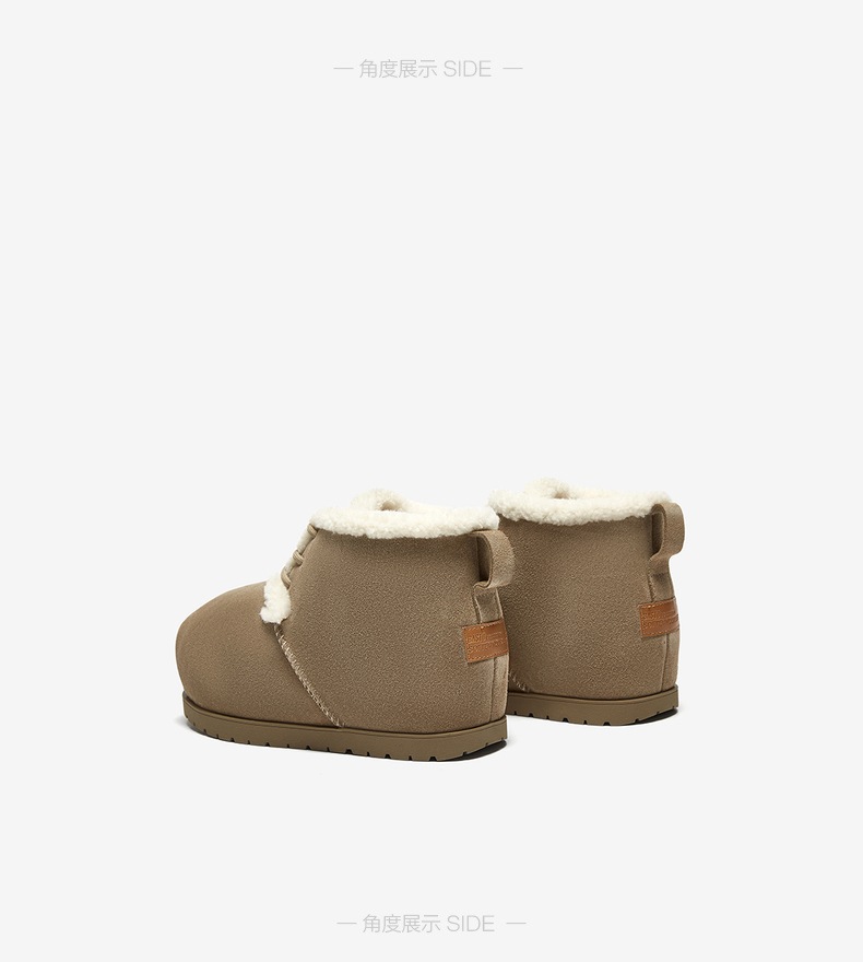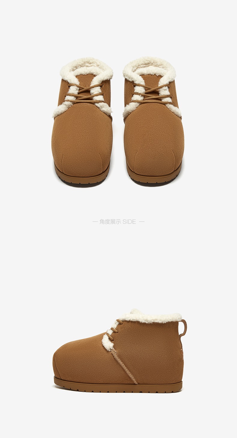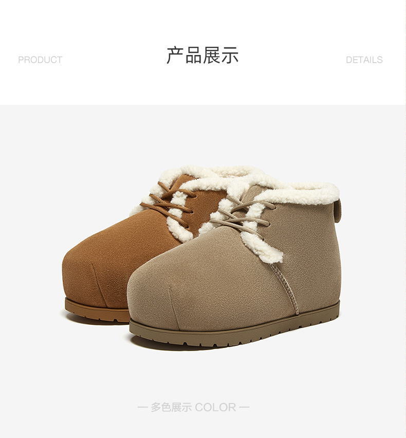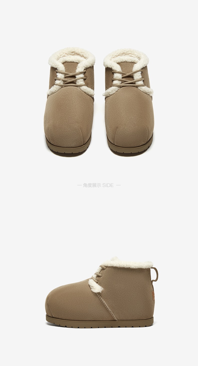 | 鞋类流行款式:雪地靴 | 鞋头款式:圆头 | 执行标准:舒适上班鞋Q/LR001-2023 | 跟高范围:低跟鞋(小于3CM) | 鞋面图案:纯色 |
