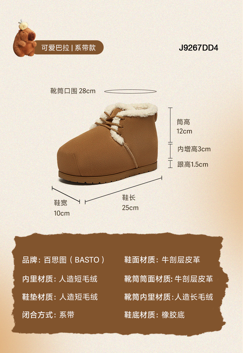 | 筒高数值:12CM | 性别:女子 | 靴筒筒面材质:牛剖层皮革 | 里料材质:人造长毛绒 | 制鞋工艺:胶贴皮鞋 |