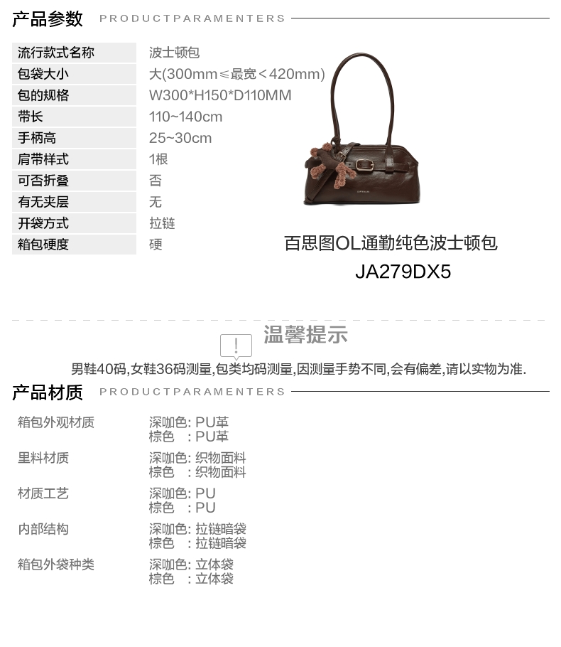 | 适用场景:通勤 | 开袋方式:拉链 | 性别:女子 | 手柄高:25~30cm | 里料材质:织物面料 |