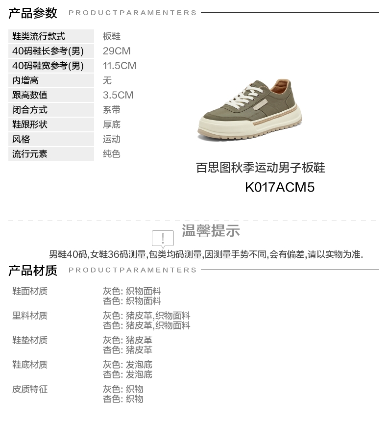 | 风格:运动 | 色系:杏色 | 跟高数值:3.5CM | 40码鞋宽参考(男):11.5CM | 性别:男子 |