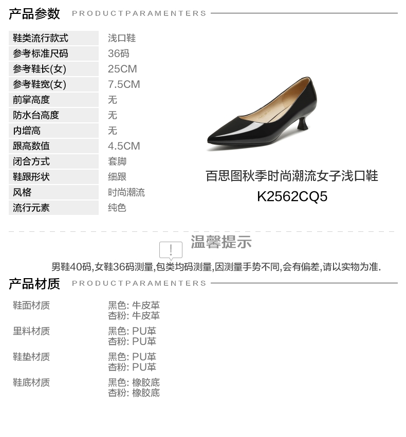 | 鞋头款式:尖头 | 鞋底材质:橡胶底 | 鞋面图案:纯色 | 内增高:无 | 鞋跟形状:细跟 |