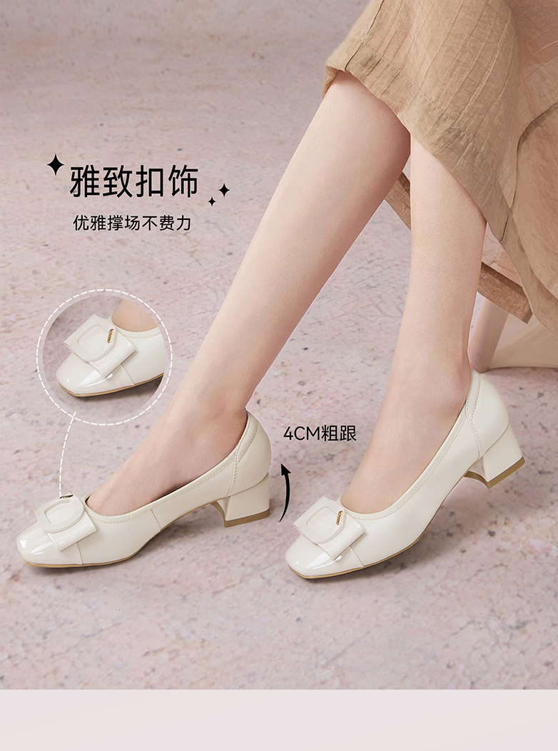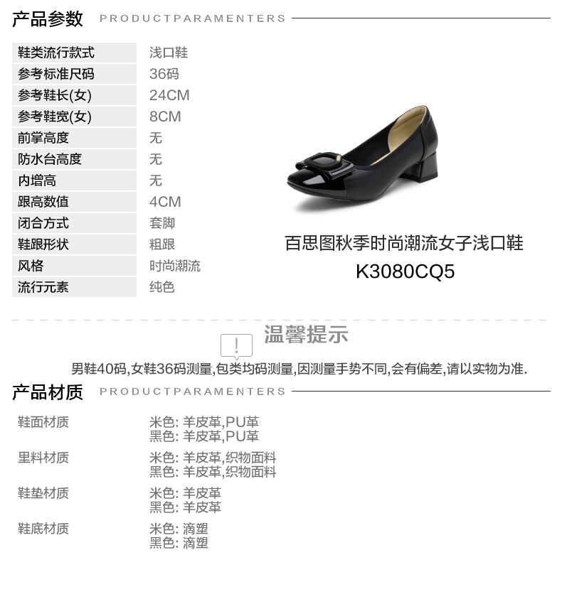 | 鞋头款式:方头 | 鞋底材质:滴塑 | 鞋面图案:纯色 | 内增高:无 | 鞋跟形状:粗跟 |