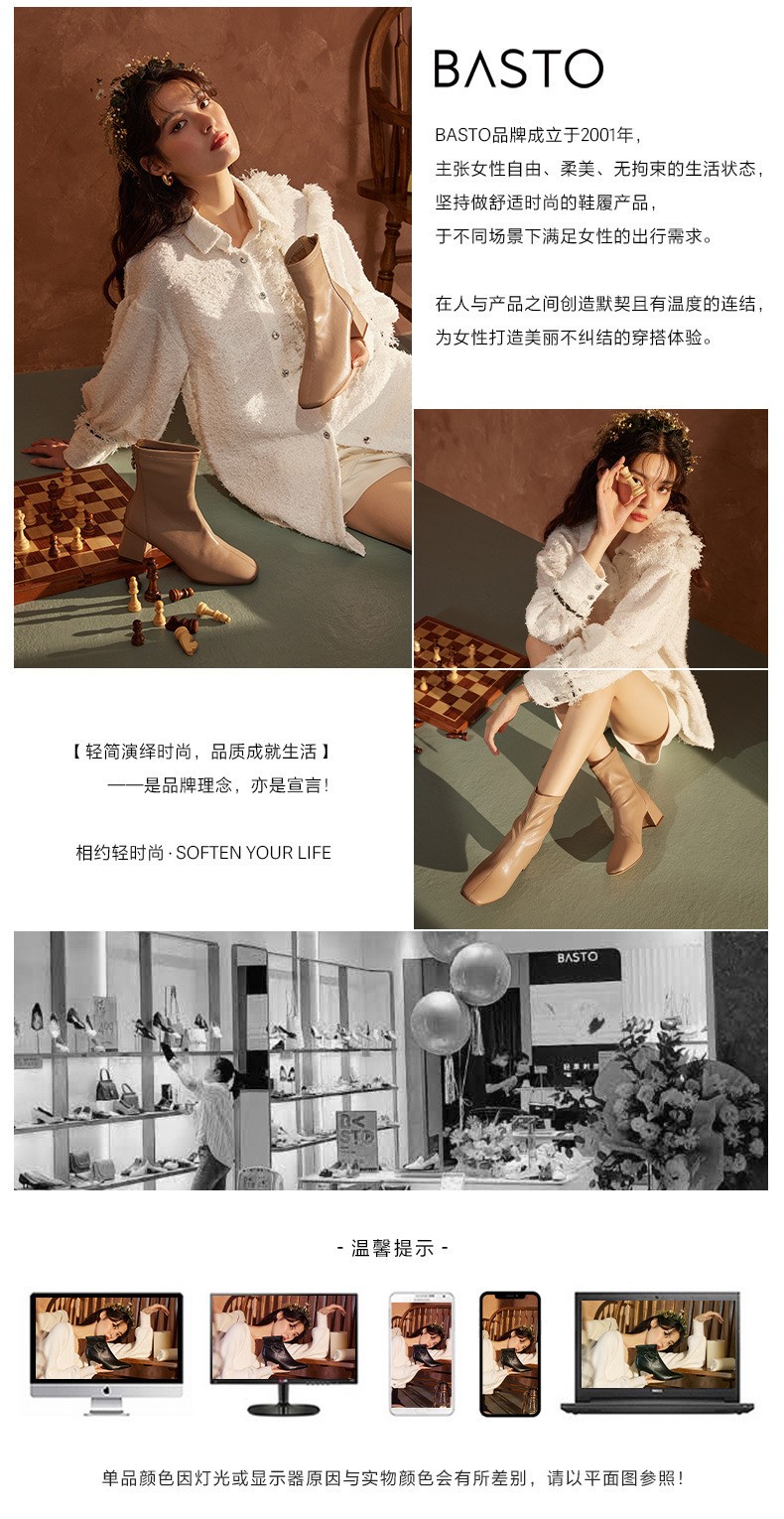 BASTO(百思图),品牌拥有17年历史,秉承优雅、甜美、清新的设计理念,主张“好嫁风”的产品风格,将甜美俏丽的少女情怀融合优雅气质的时尚品味,塑造出唯美优雅、受欢迎的女鞋款式。主打以女性温柔与亲和力为特色的流行时尚产品,糅合雅致又富有亲和力的裸粉色调,淑媛端庄、清新甜美。目前品牌已开设线下门店达1400多家。