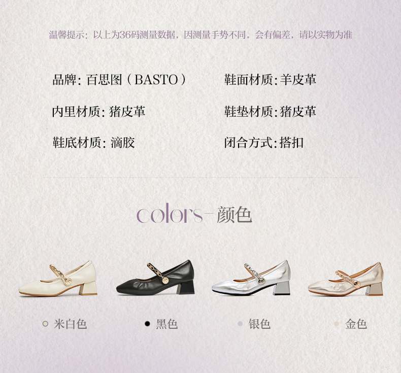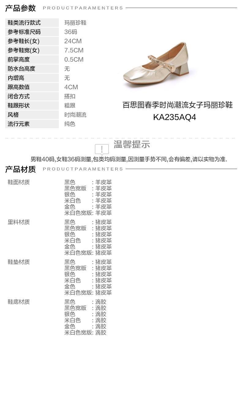 | 款式季节:春季 | 鞋垫材质:猪皮革 | 渠道划分:线下同步 | 前掌高度:0.5CM | 皮质特征:羊皮革 |