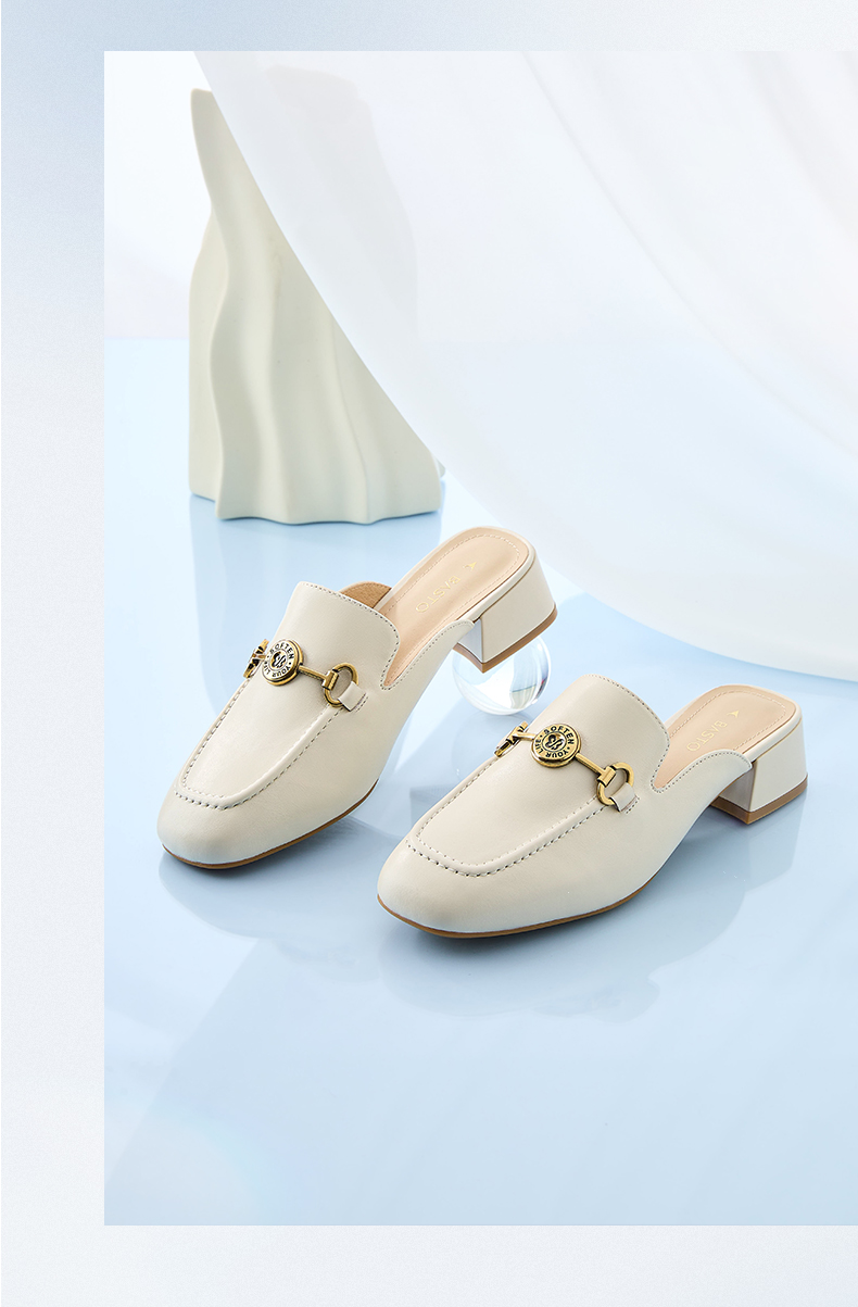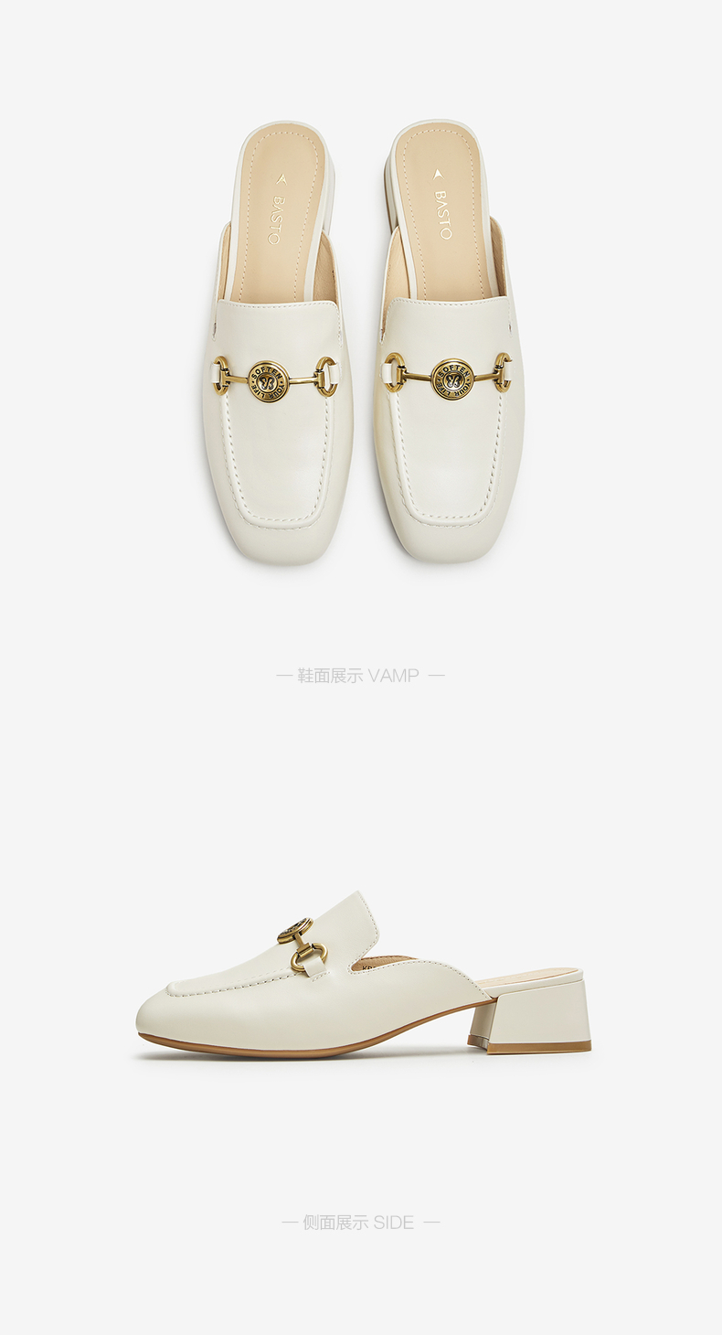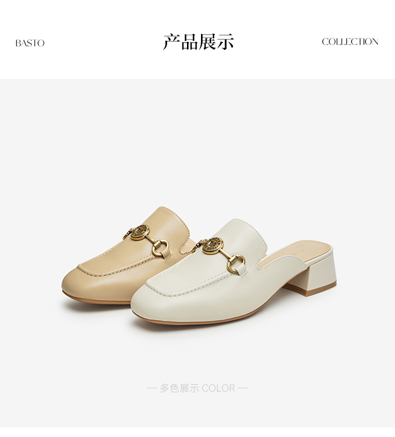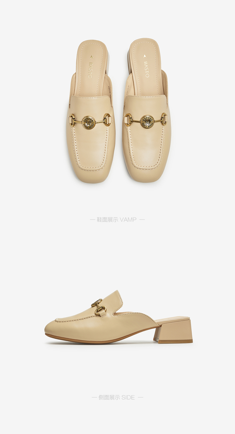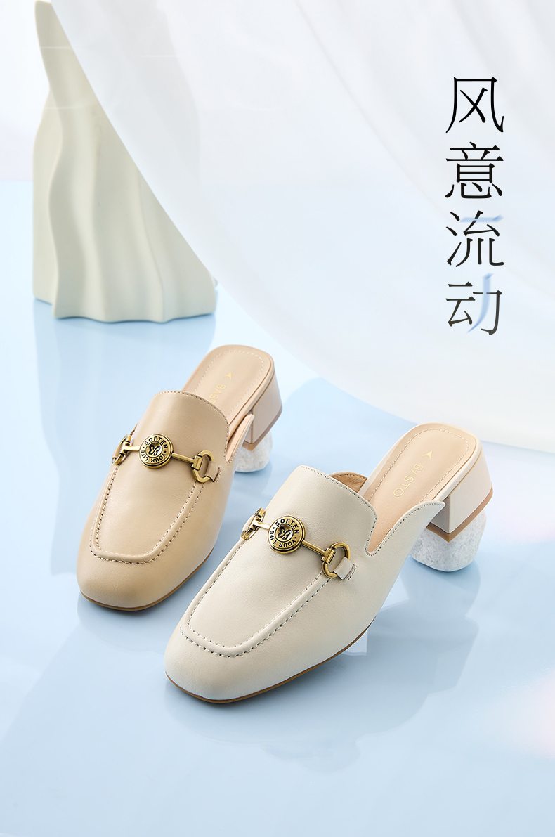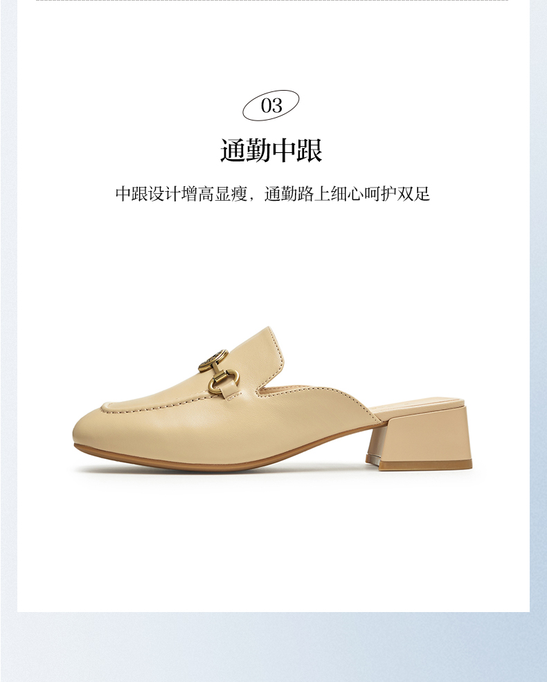 | 鞋类流行款式:穆勒鞋 | 鞋头款式:方头 | 执行标准:皮凉鞋GB/T22756-2017 | 跟高范围:中跟鞋(3-5CM) | 鞋面图案:纯色 |