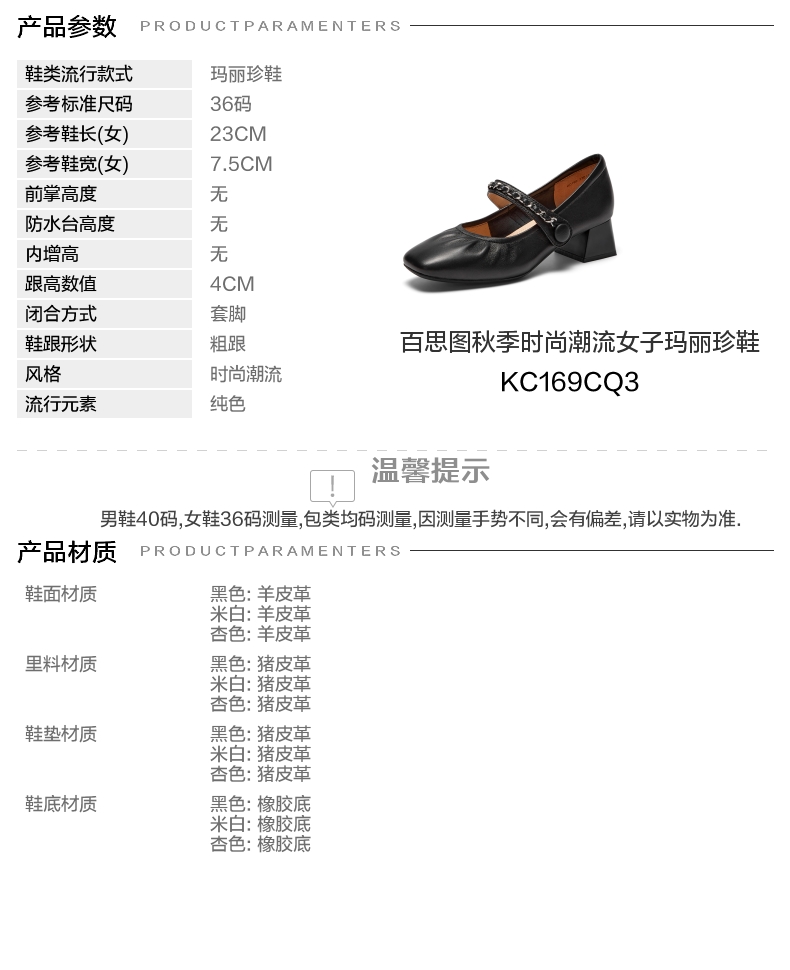 | 皮质特征:羊皮革 | 前掌高度:无 | 防水台高度:无 | 鞋类流行款式:玛丽珍鞋 |