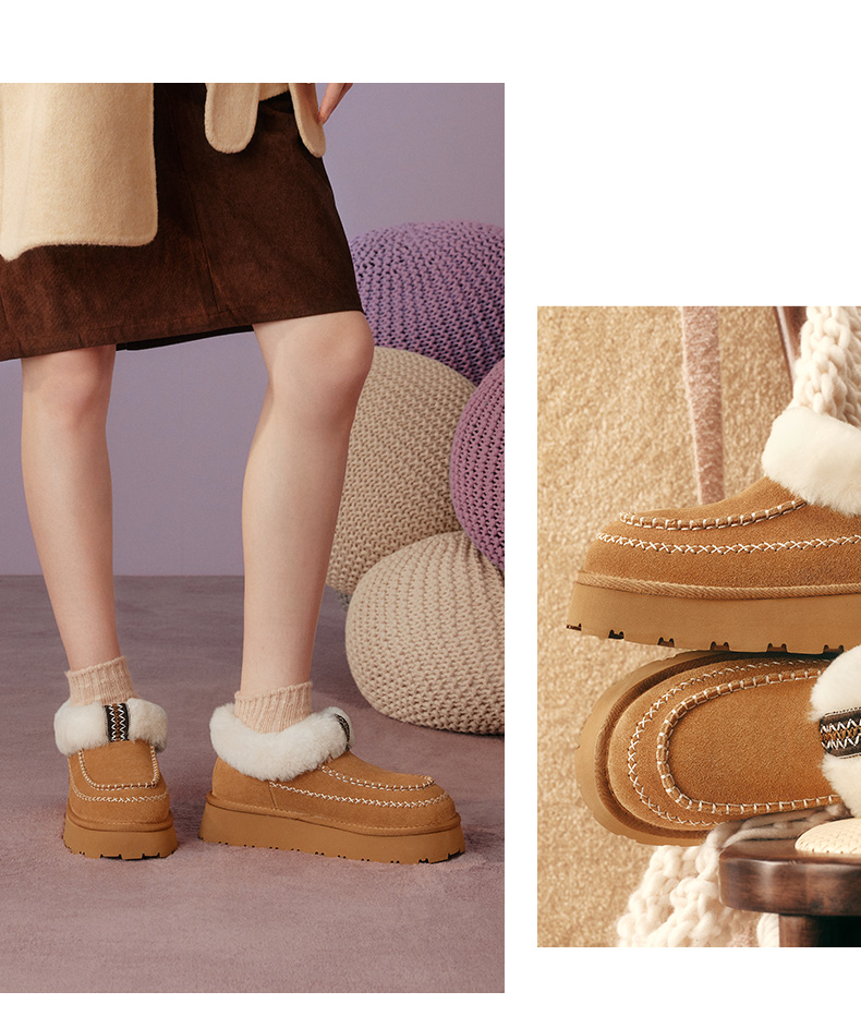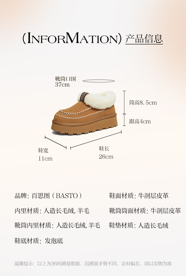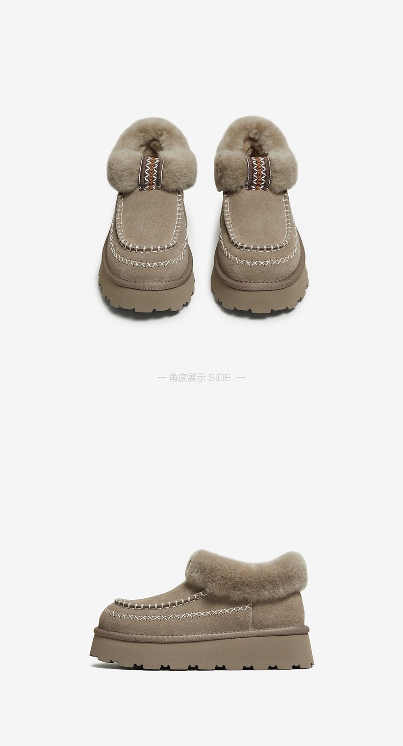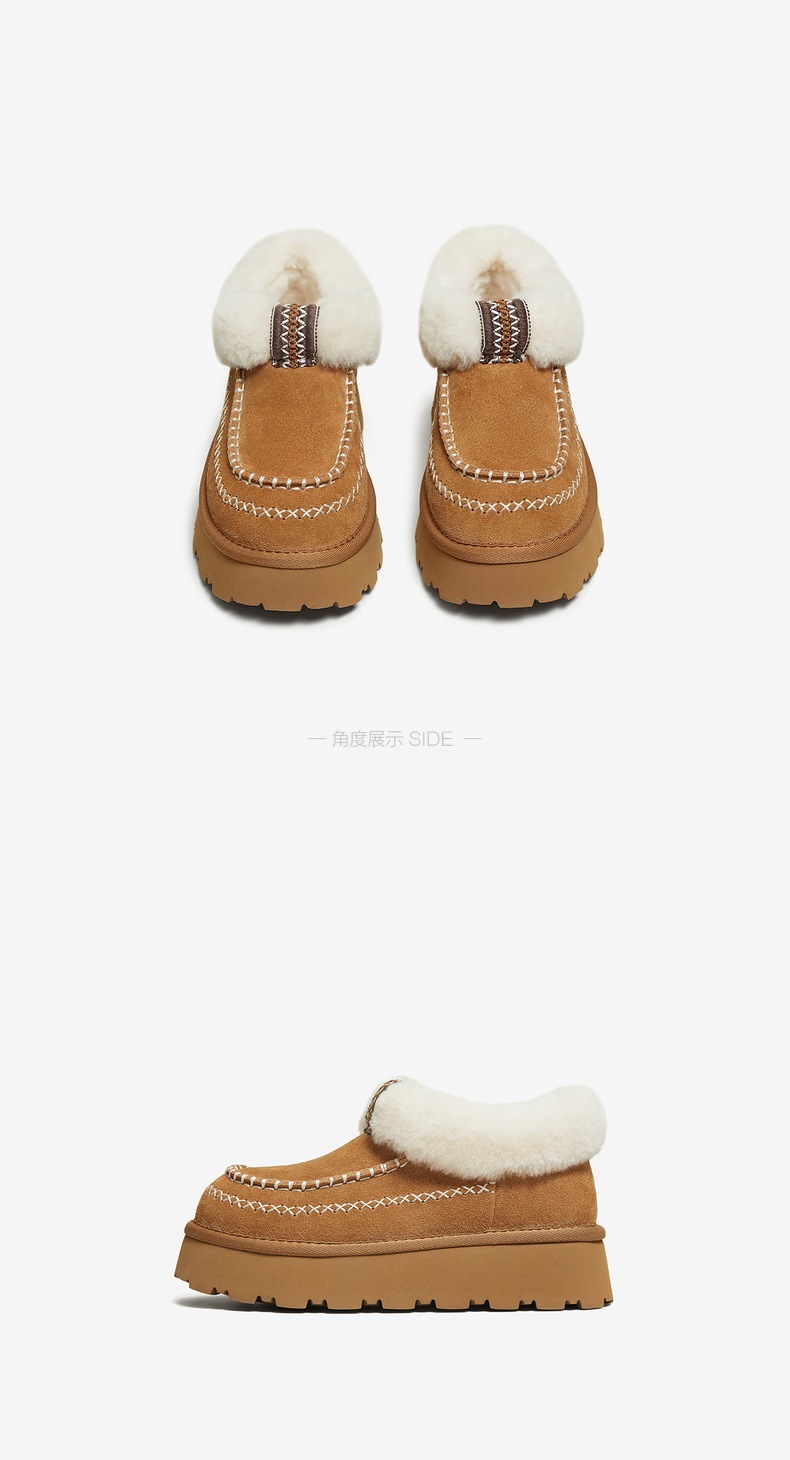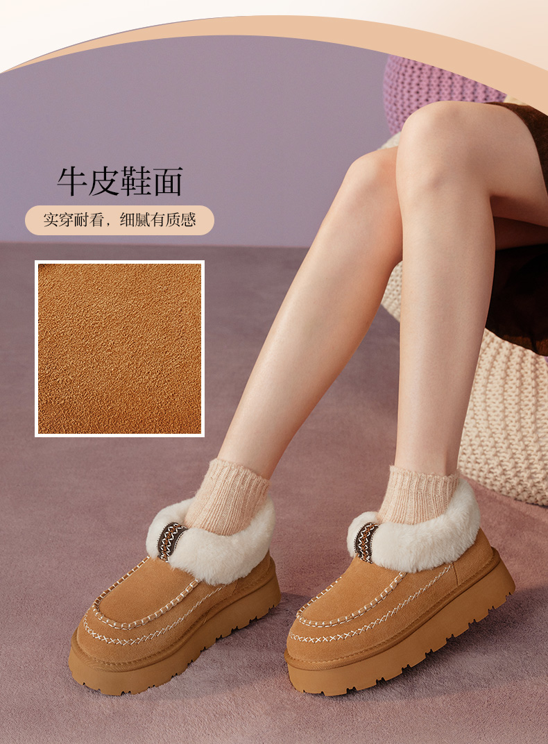 | 帮面材质:牛剖层革 | 配跟:无 | 靴筒口围:37CM | 上市时间:2025年冬季 | 鞋类流行款式:雪地靴 |