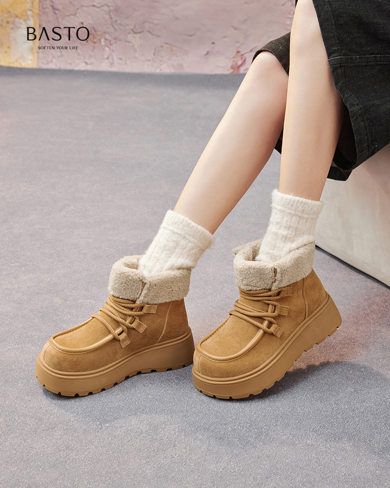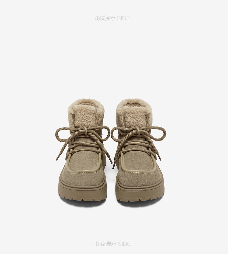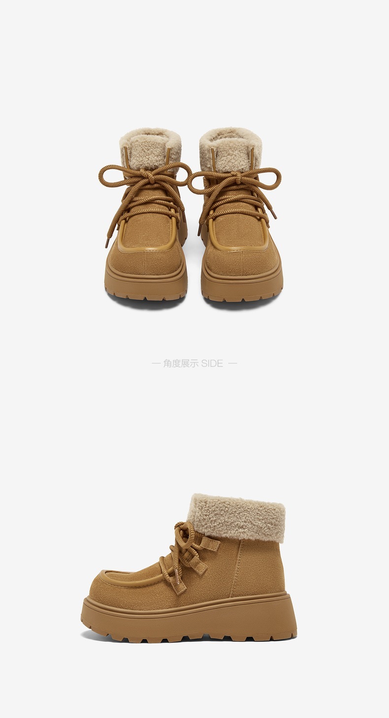 | 鞋底材质:橡胶底 | 靴筒内里材质:人造长毛绒 | 内增高:无 | 鞋面材质:牛剖层皮革 | 闭合方式:系带 |