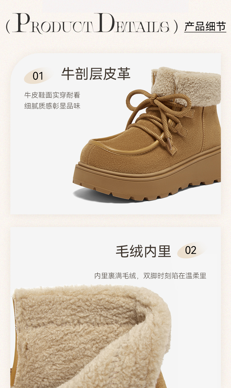 | 帮面材质:牛剖层革 | 配跟:无 | 靴筒口围:31CM | 上市时间:2025年冬季 | 鞋类流行款式:雪地靴 |