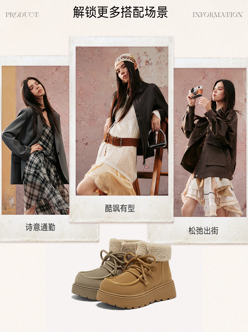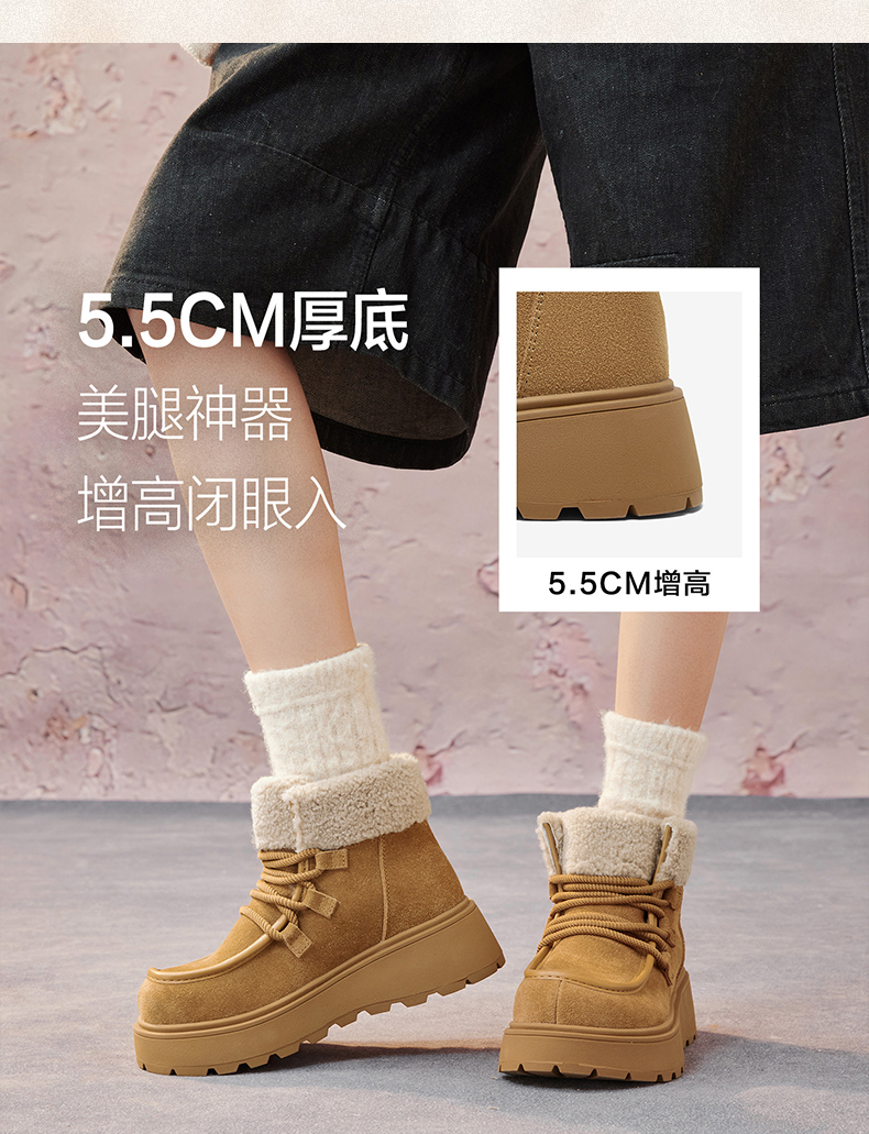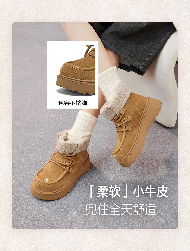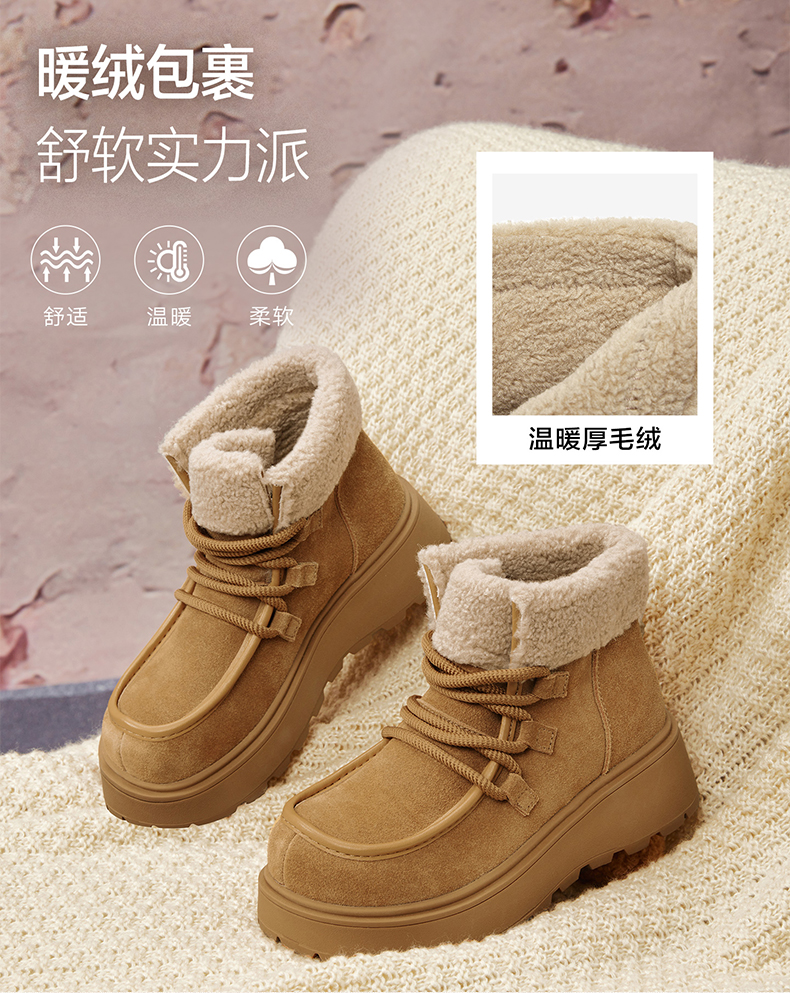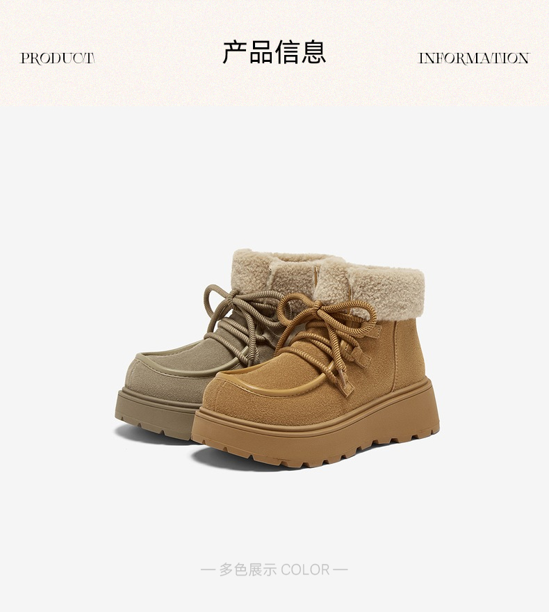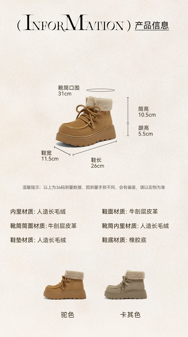 | 帮面材质:牛剖层革 | 配跟:无 | 靴筒口围:31CM | 上市时间:2025年冬季 | 鞋类流行款式:雪地靴 |