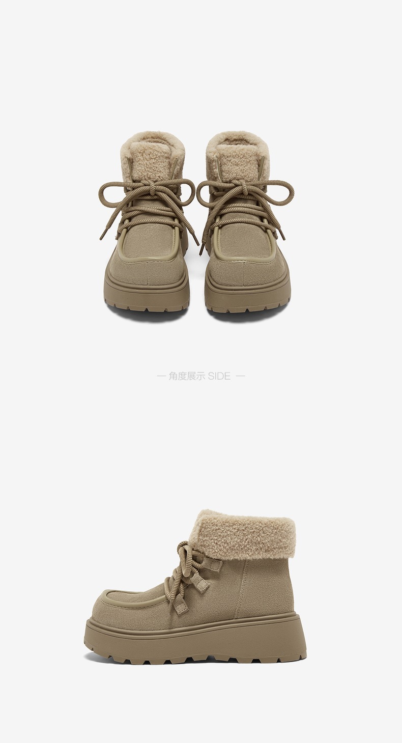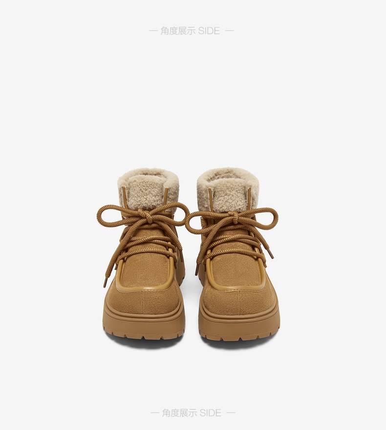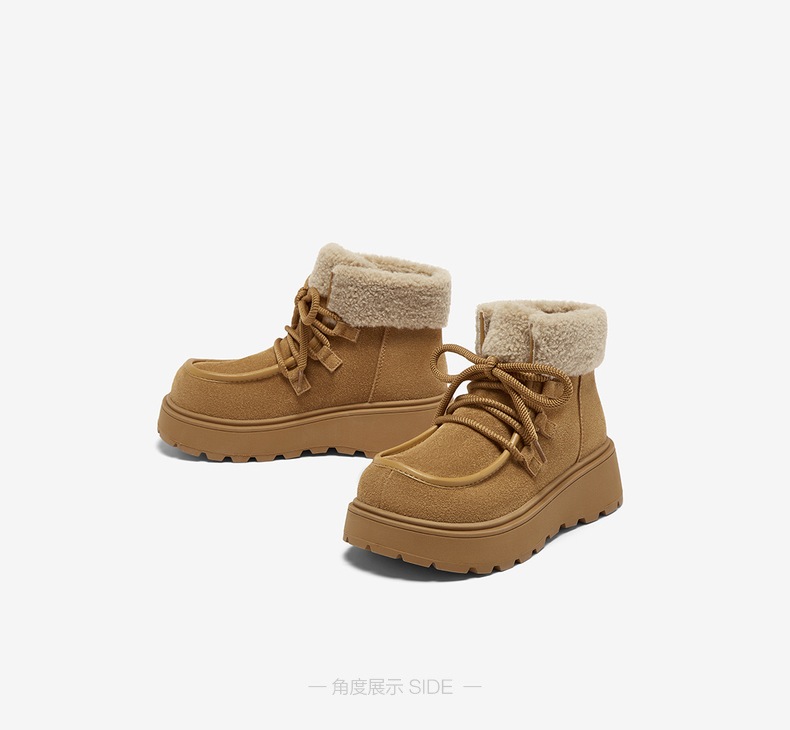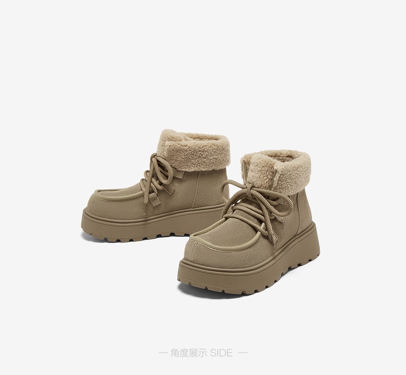 | 鞋底材质:橡胶底 | 靴筒内里材质:人造长毛绒 | 内增高:无 | 鞋面材质:牛剖层皮革 | 闭合方式:系带 |