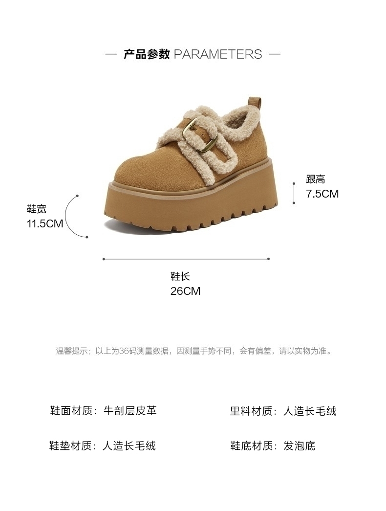 | 制鞋工艺:胶贴皮鞋 | 鞋垫材质:人造长毛绒 | 款式季节:冬季 | 前掌高度:5CM | 皮质特征:无 |