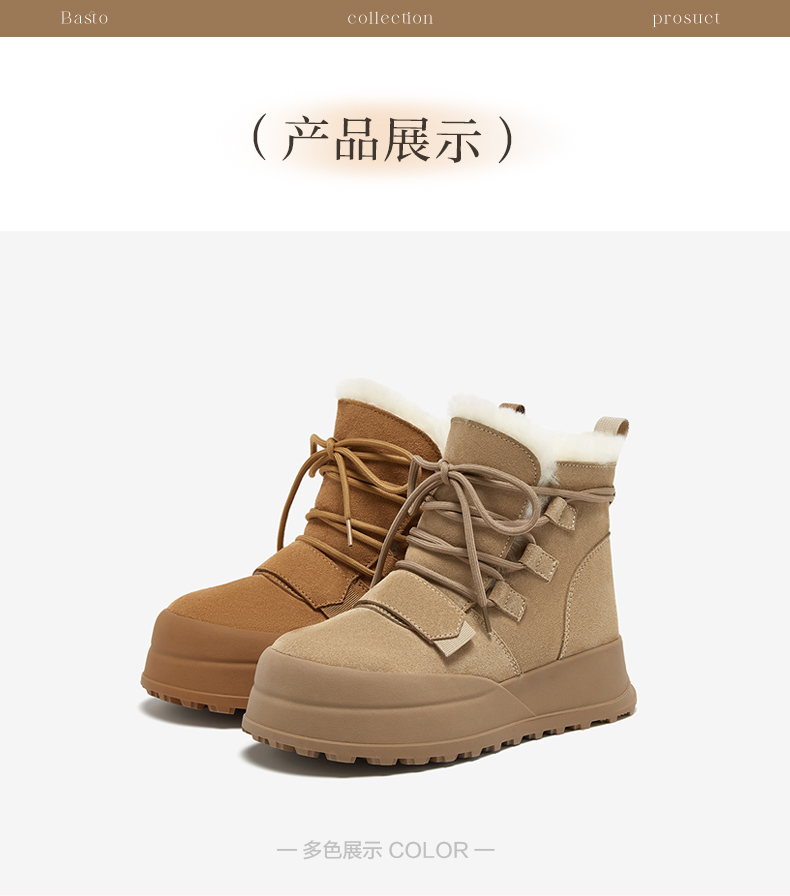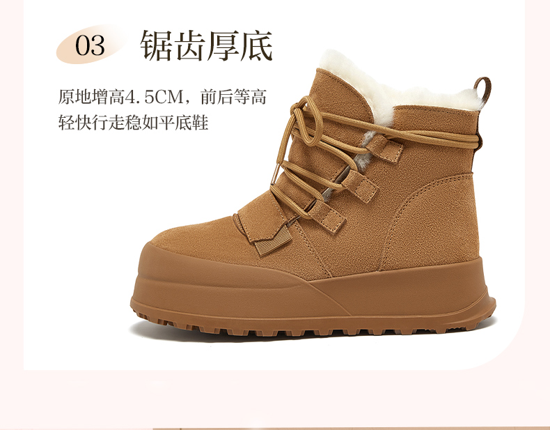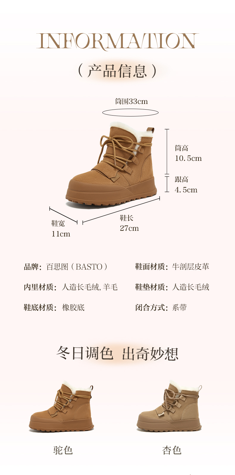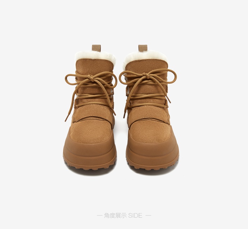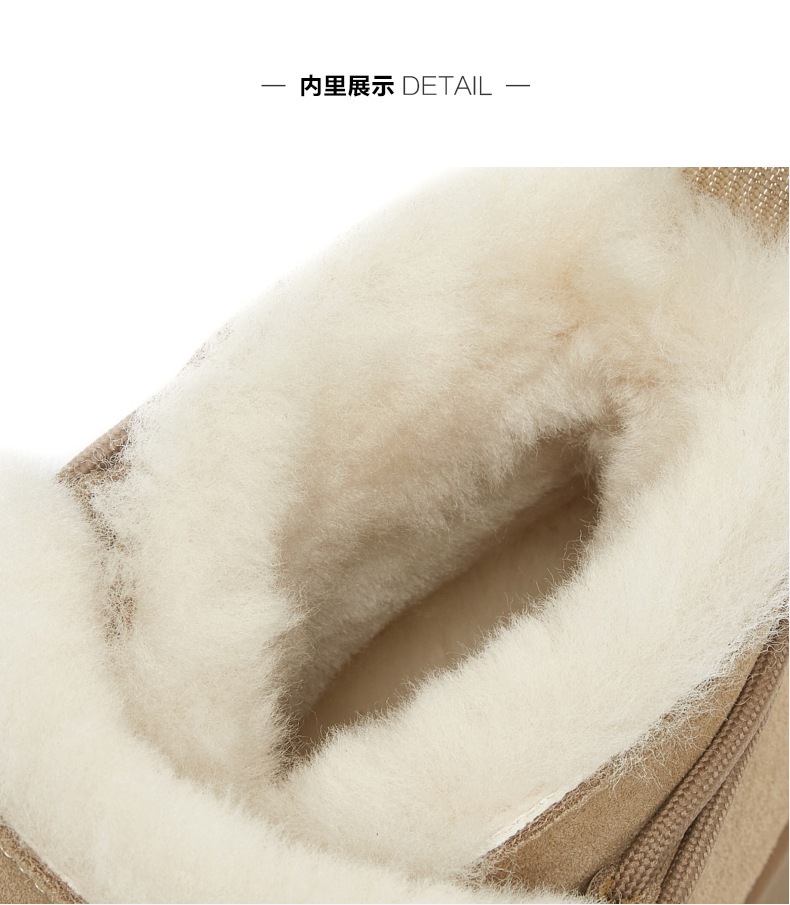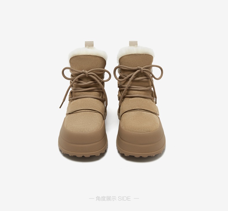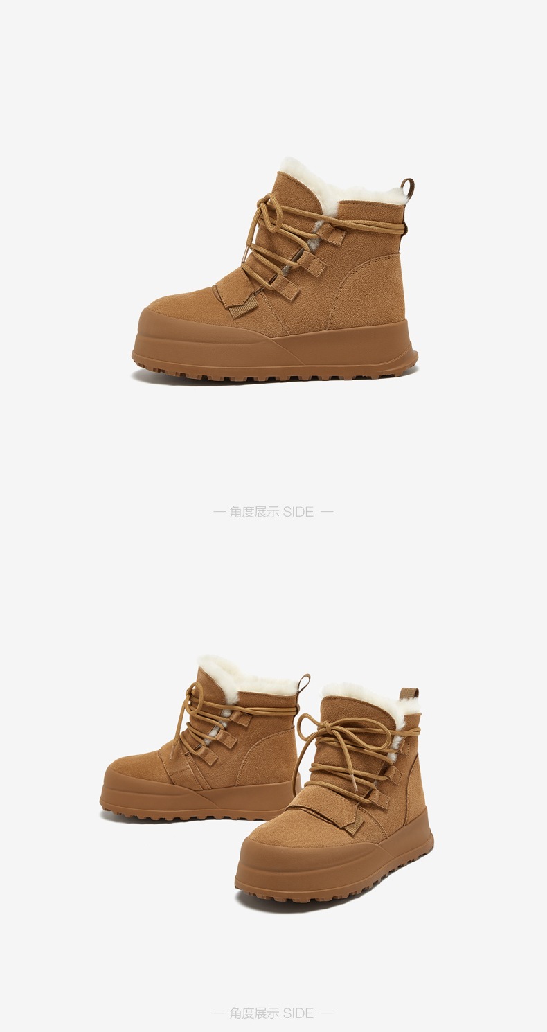 | 鞋底材质:橡胶底 | 靴筒内里材质:羊毛人造长毛绒 | 内增高:无 | 鞋面材质:牛剖层皮革 | 闭合方式:系带 |