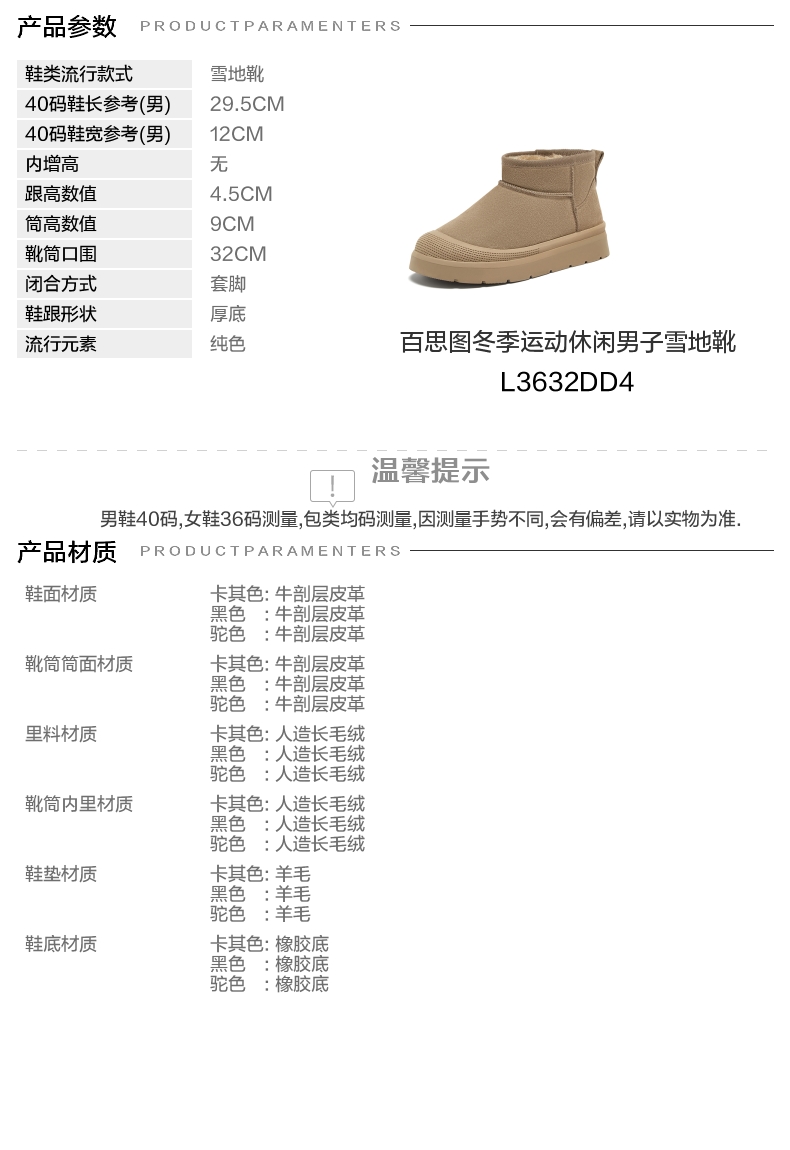 | 跟高数值:4.5CM | 筒高数值:9CM | 性别:男子 | 靴筒筒面材质:牛剖层皮革 | 里料材质:人造长毛绒 |