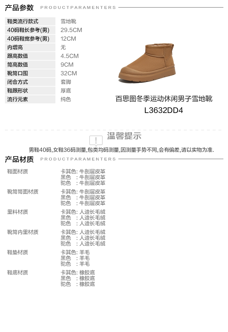 | 闭合方式:套脚 | 40码鞋宽参考(男):12CM | 靴筒口围:32CM | 上市时间:2024年冬季 | 鞋类流行款式:雪地靴 |