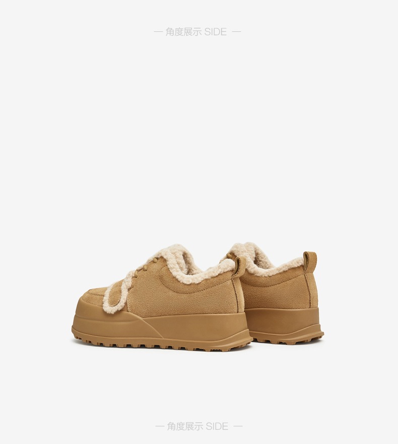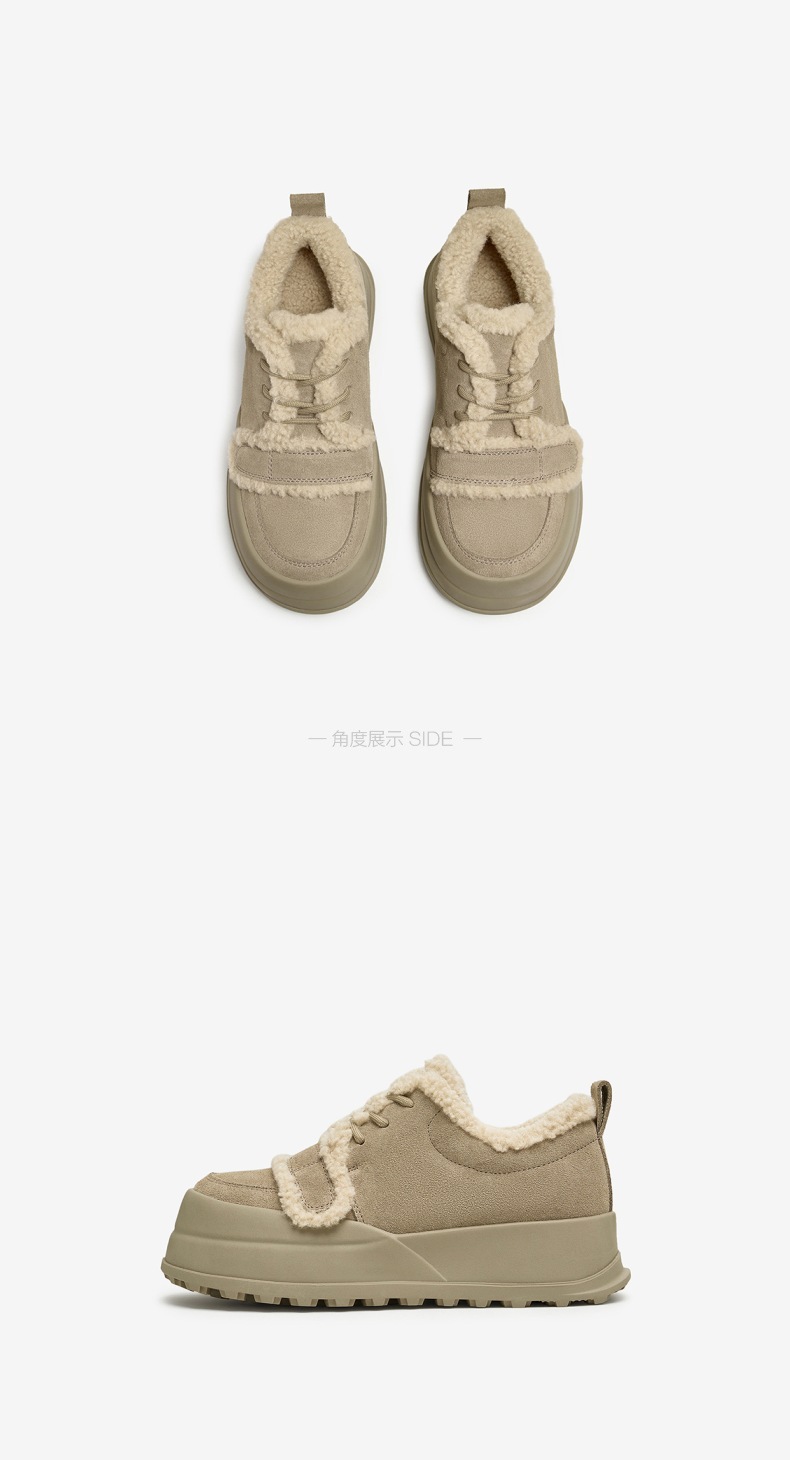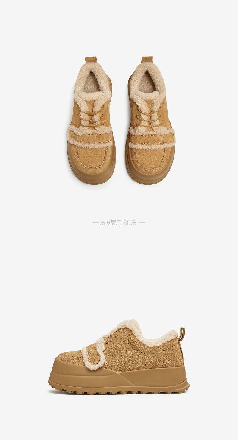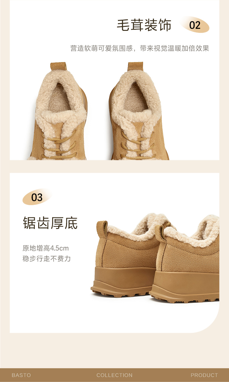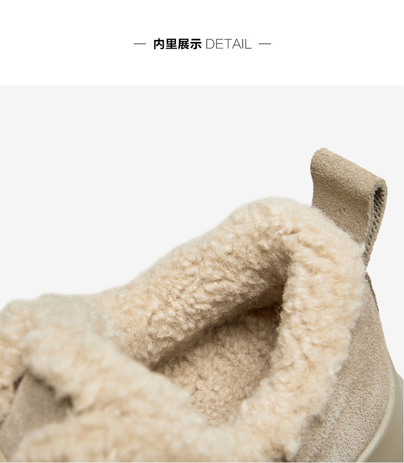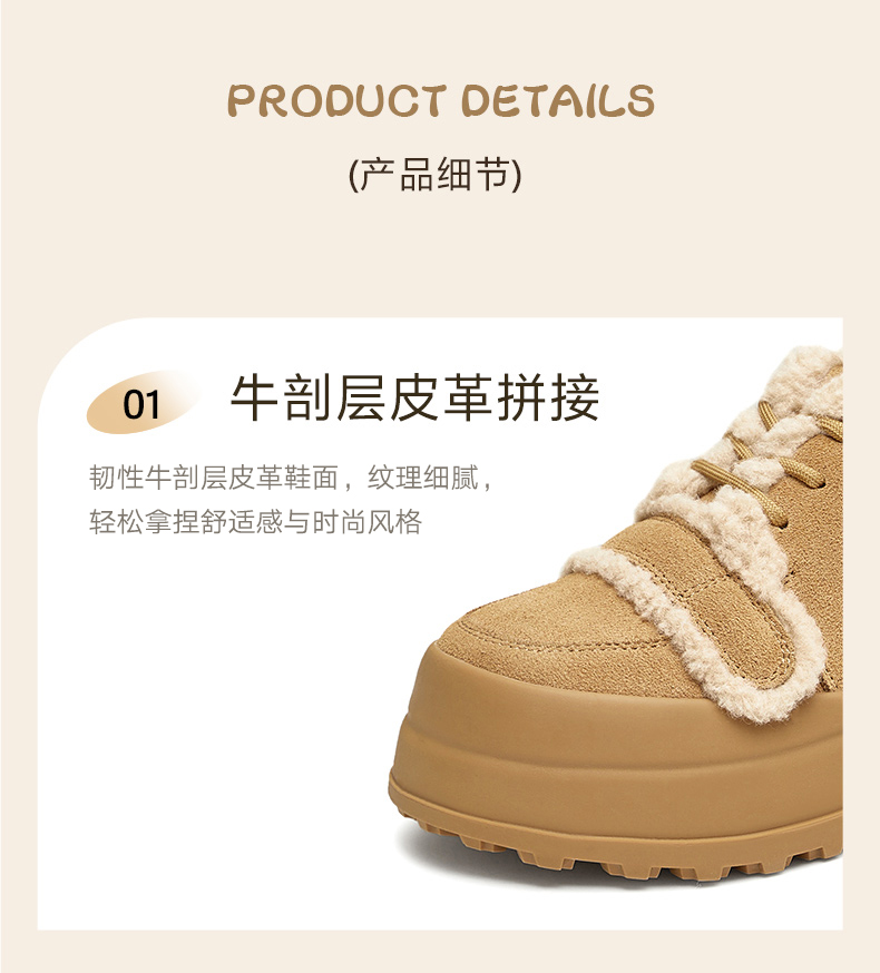 | 鞋底材质:橡胶底 | 靴筒内里材质:人造长毛绒 | 内增高:无 | 鞋面材质:牛剖层皮革 | 闭合方式:系带 |