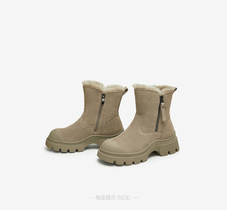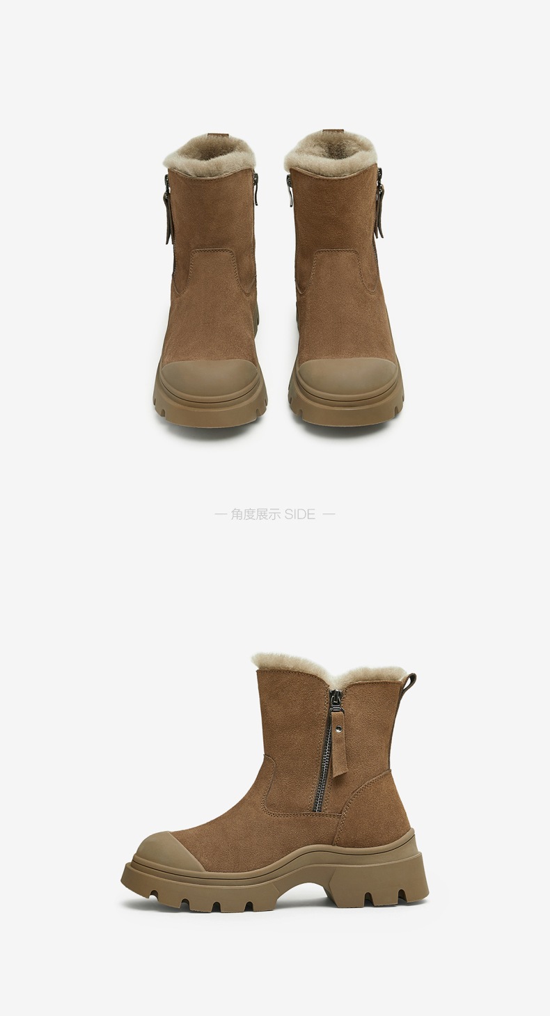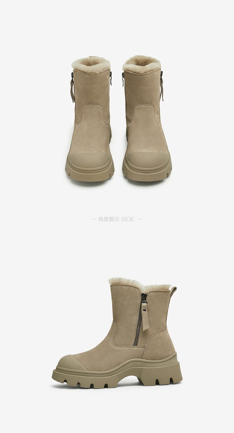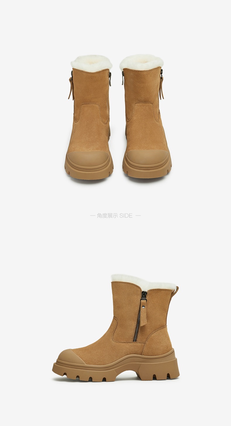 | 筒高数值:14CM | 性别:女子 | 靴筒筒面材质:牛剖层皮革 | 里料材质:羊毛人造长毛绒 | 制鞋工艺:车线胶粘 |