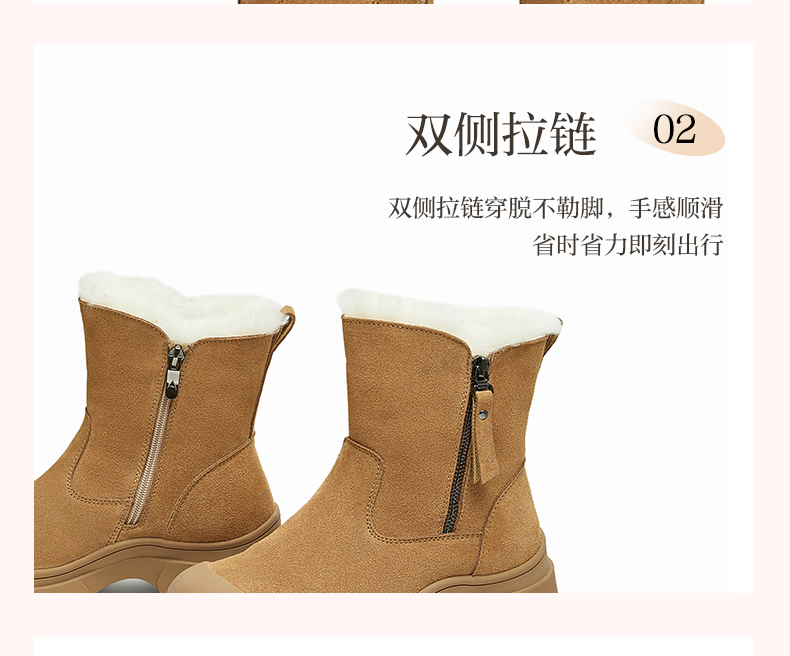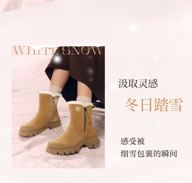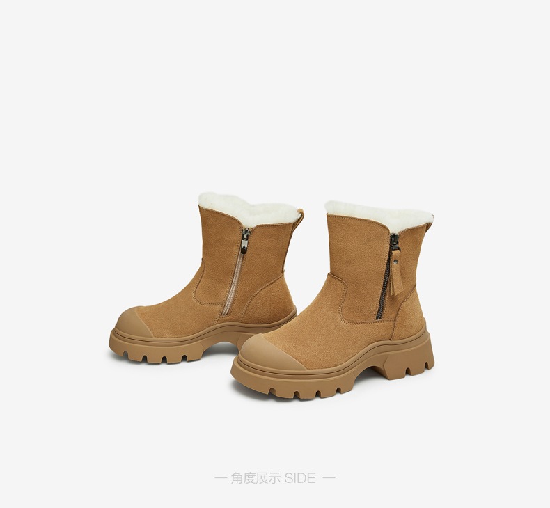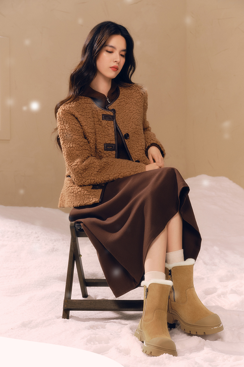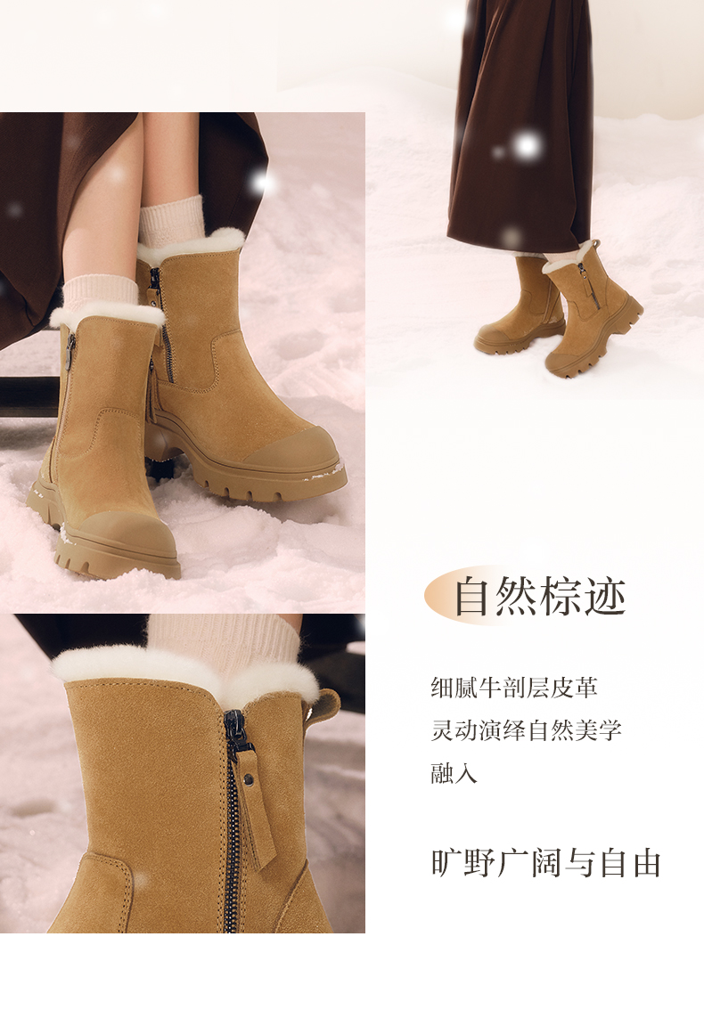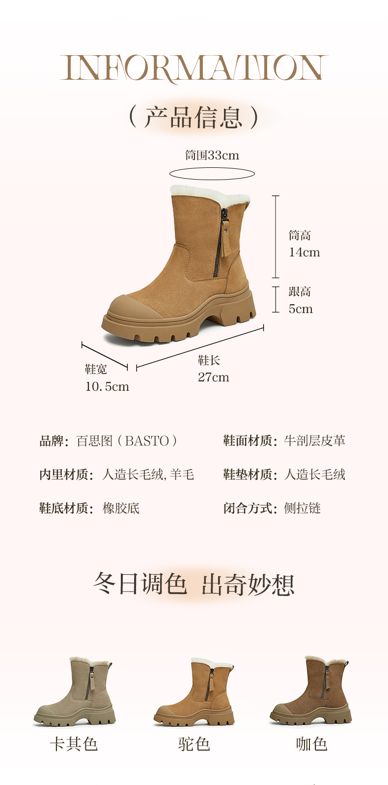 | 筒高数值:14CM | 性别:女子 | 靴筒筒面材质:牛剖层皮革 | 里料材质:羊毛人造长毛绒 | 制鞋工艺:车线胶粘 |