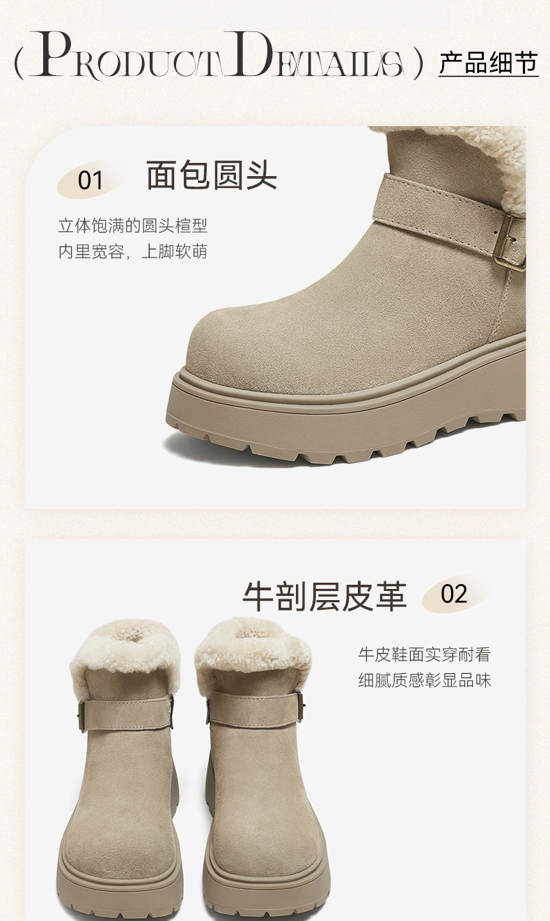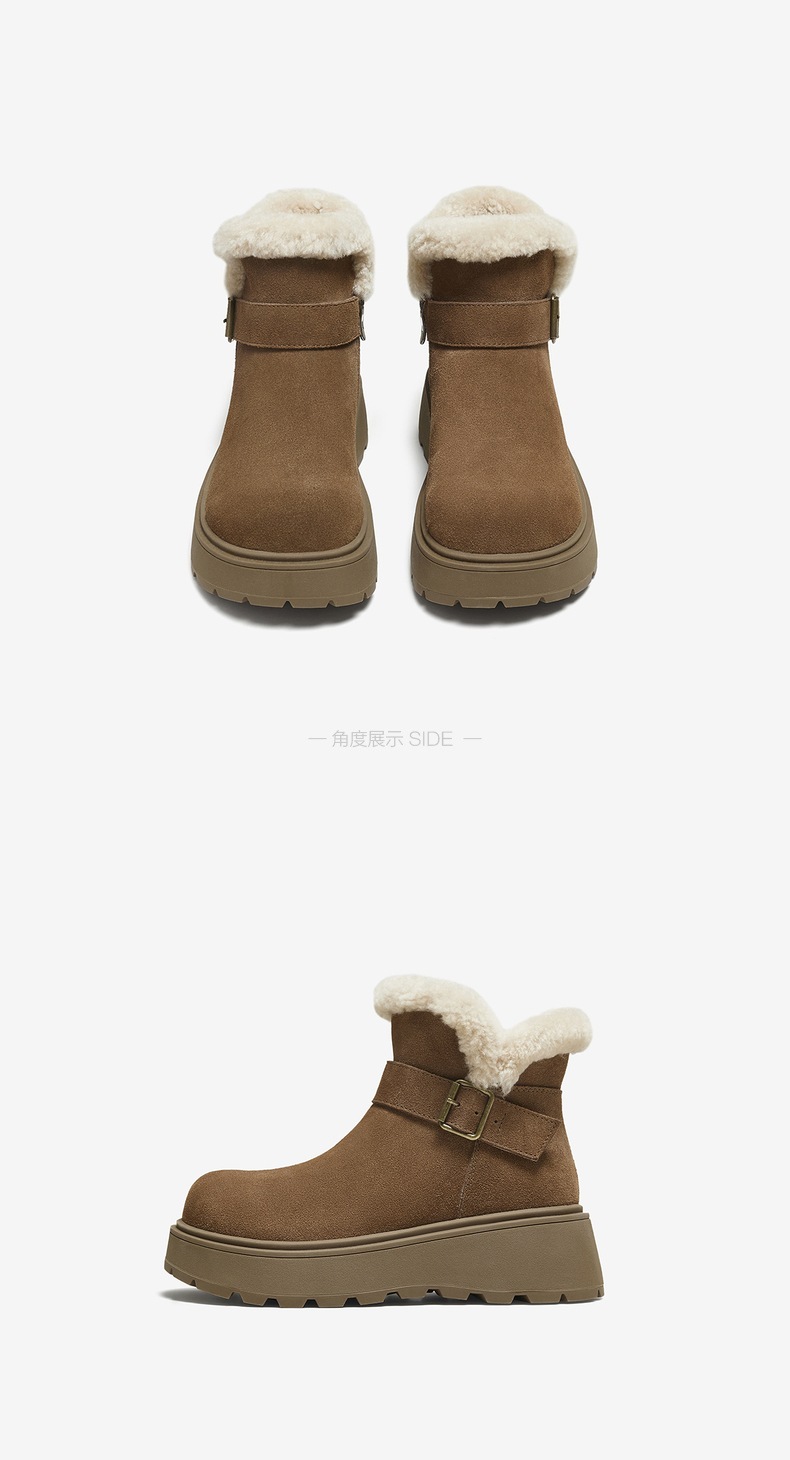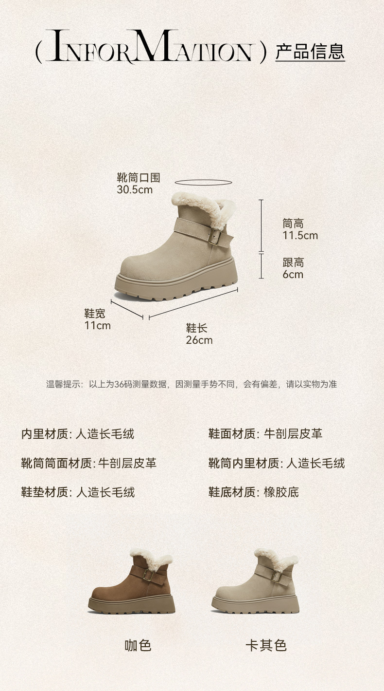 | 帮面材质:牛剖层革 | 配跟:无 | 靴筒口围:30.5CM | 上市时间:2025年冬季 | 鞋类流行款式:雪地靴 |