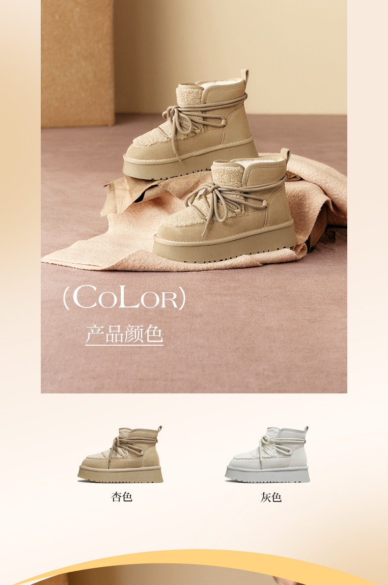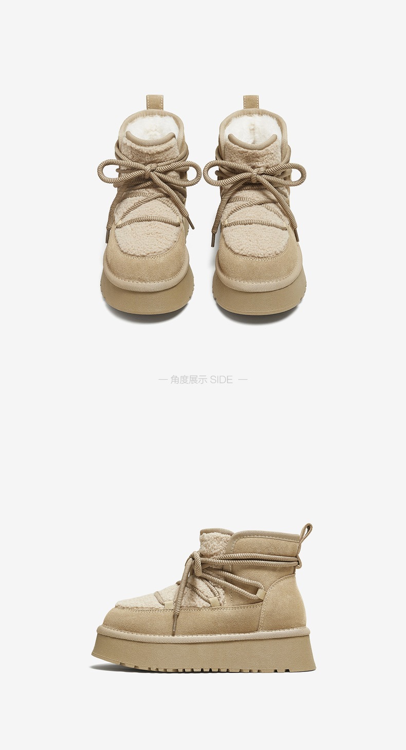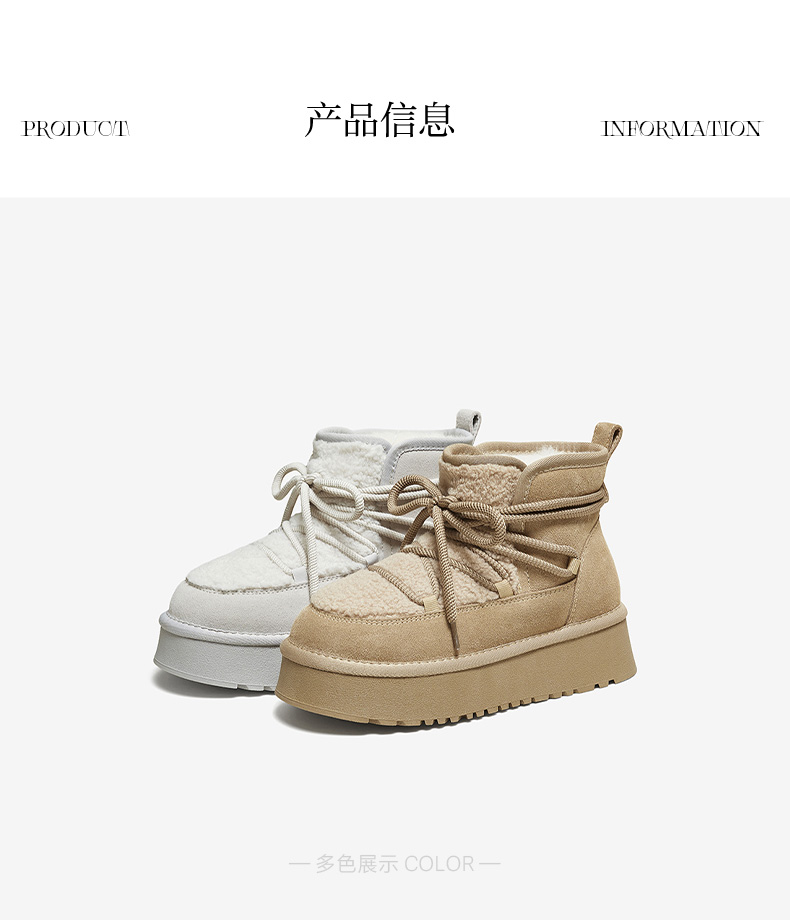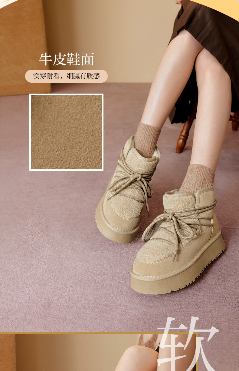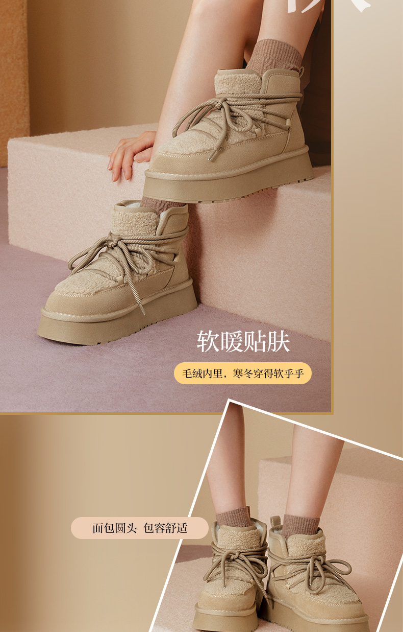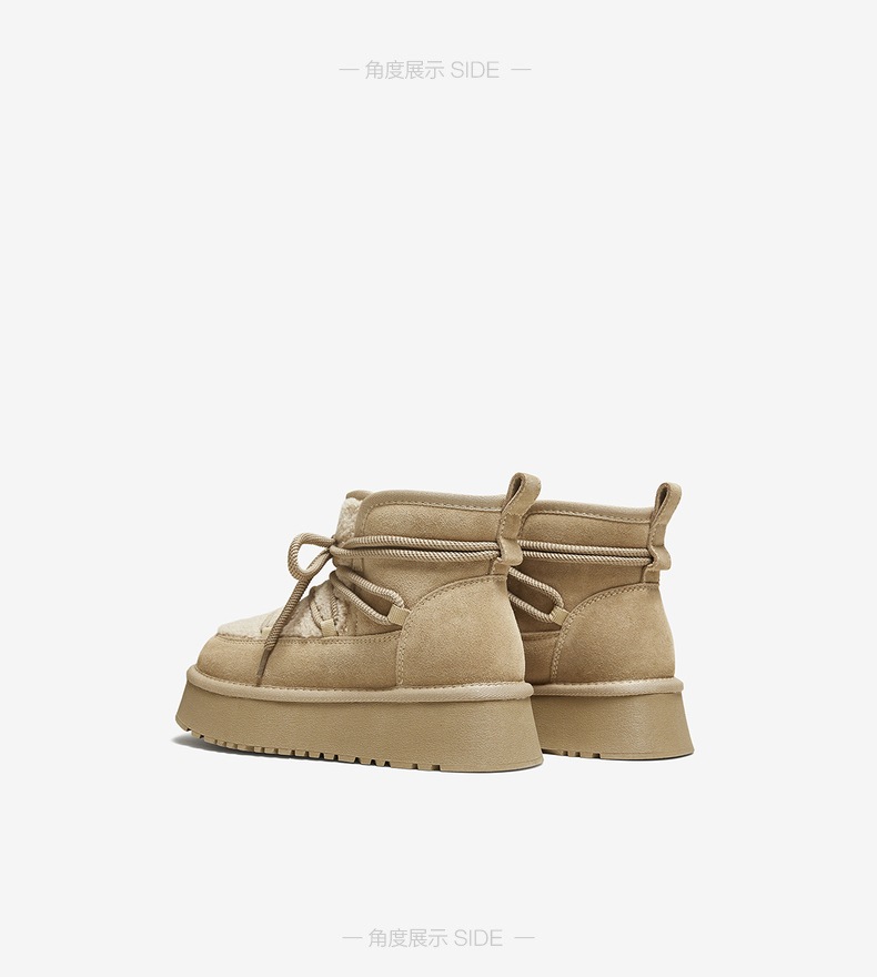 | 帮面材质:织物牛剖层革 | 配跟:无 | 靴筒口围:33CM | 上市时间:2025年冬季 | 鞋类流行款式:雪地靴 |