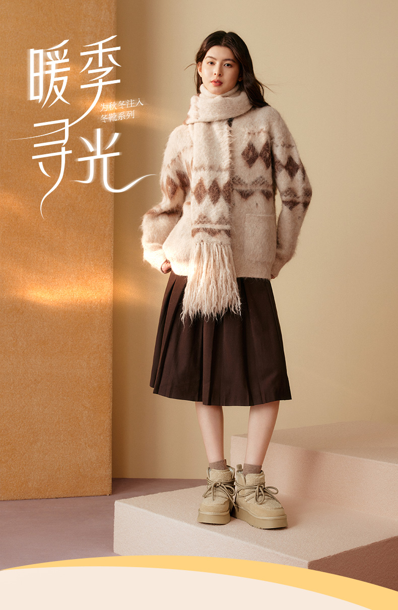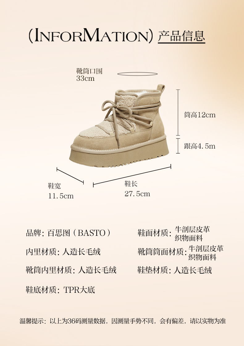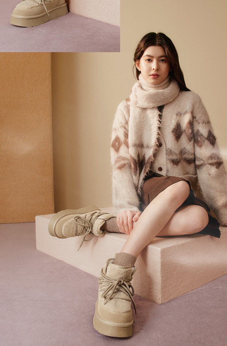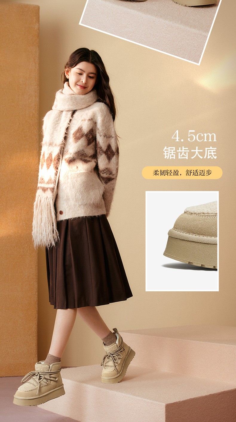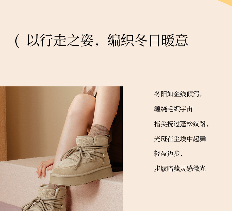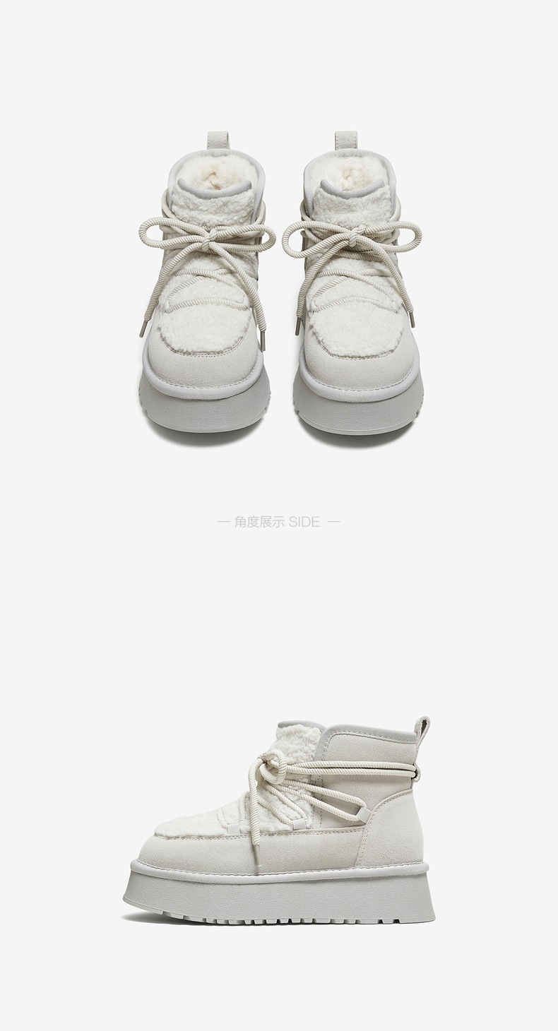 | 帮面材质:织物牛剖层革 | 配跟:无 | 靴筒口围:33CM | 上市时间:2025年冬季 | 鞋类流行款式:雪地靴 |