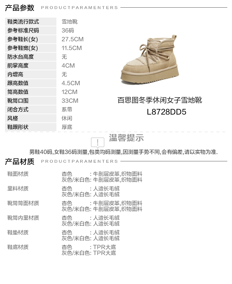 | 款式季节:冬季 | 前掌高度:4CM | 皮质特征:无 | 防水台高度:无 |