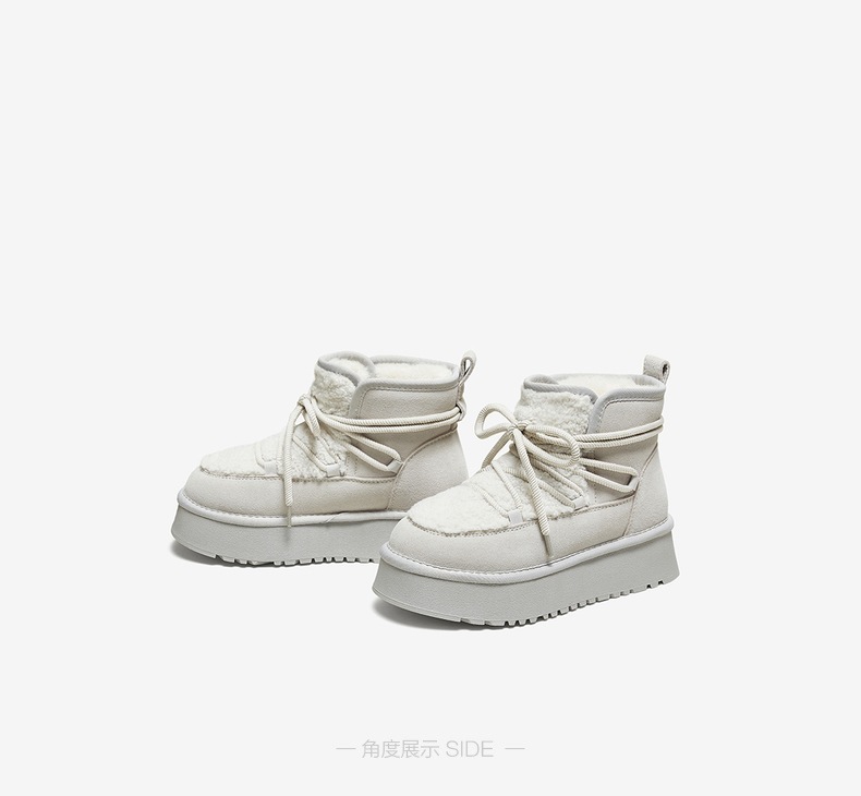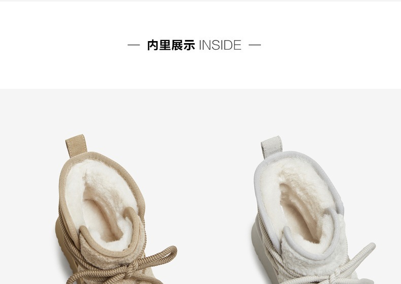 | 鞋底材质:TPR大底 | 靴筒内里材质:人造长毛绒 | 内增高:无 | 鞋面材质:织物面料牛剖层皮革 | 闭合方式:系带 |