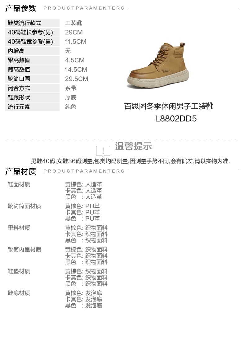 | 闭合方式:系带 | 40码鞋宽参考(男):11.5CM | 靴筒口围:29.5CM | 上市时间:2025年冬季 | 鞋类流行款式:工装靴 |