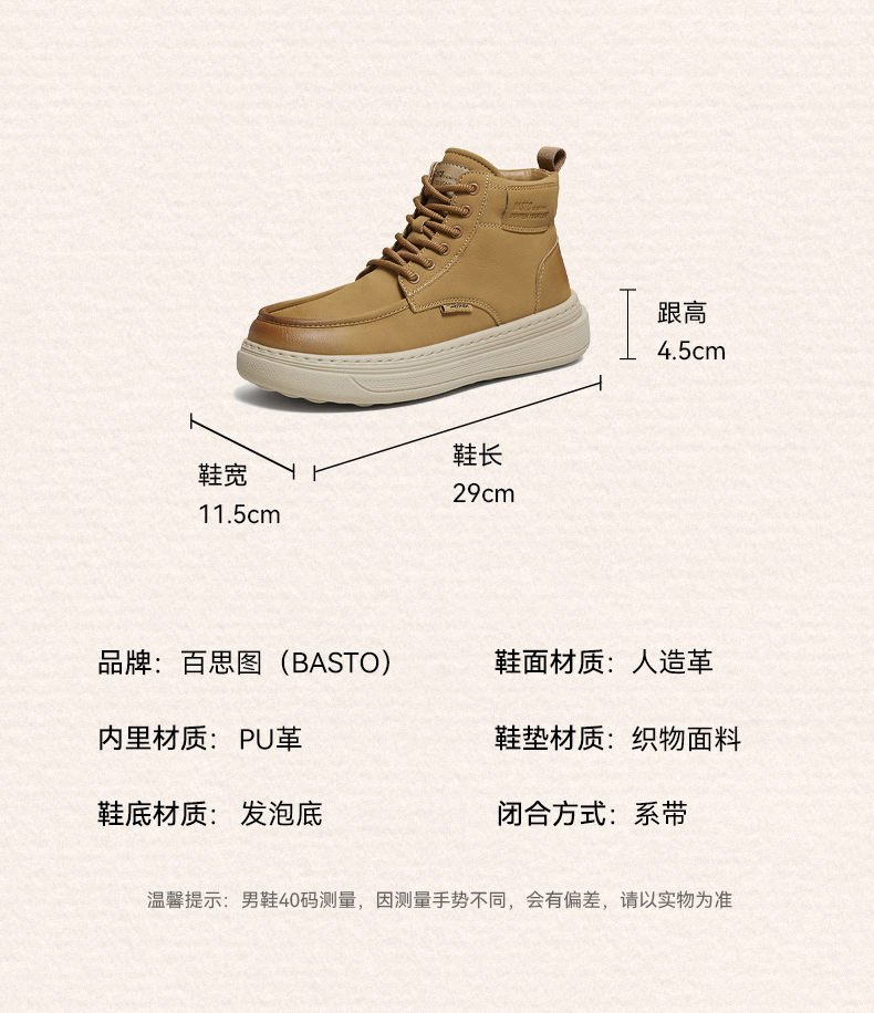 | 40码鞋长参考(男):29CM | 鞋底材质:发泡底 | 靴筒内里材质:织物面料 | 内增高:无 | 鞋面材质:人造革 |