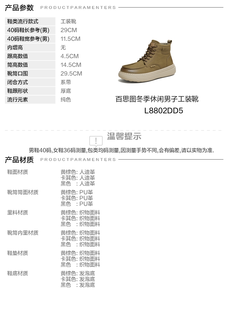 | 闭合方式:系带 | 40码鞋宽参考(男):11.5CM | 靴筒口围:29.5CM | 上市时间:2025年冬季 | 鞋类流行款式:工装靴 |