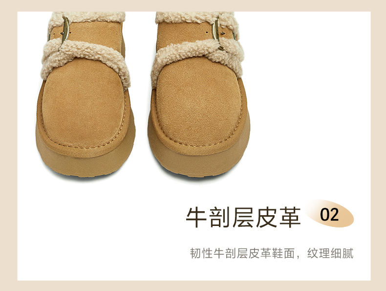 | 鞋底材质:TPR大底 | 靴筒内里材质:人造长毛绒 | 内增高:无 | 鞋面材质:牛剖层皮革 | 闭合方式:搭扣 |