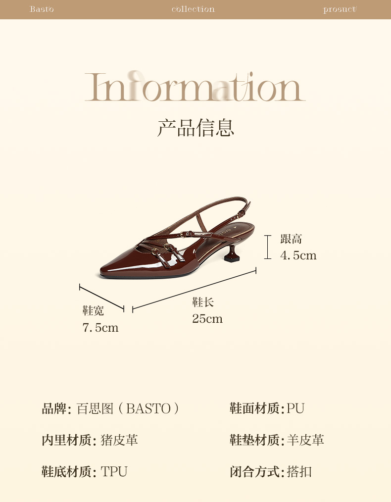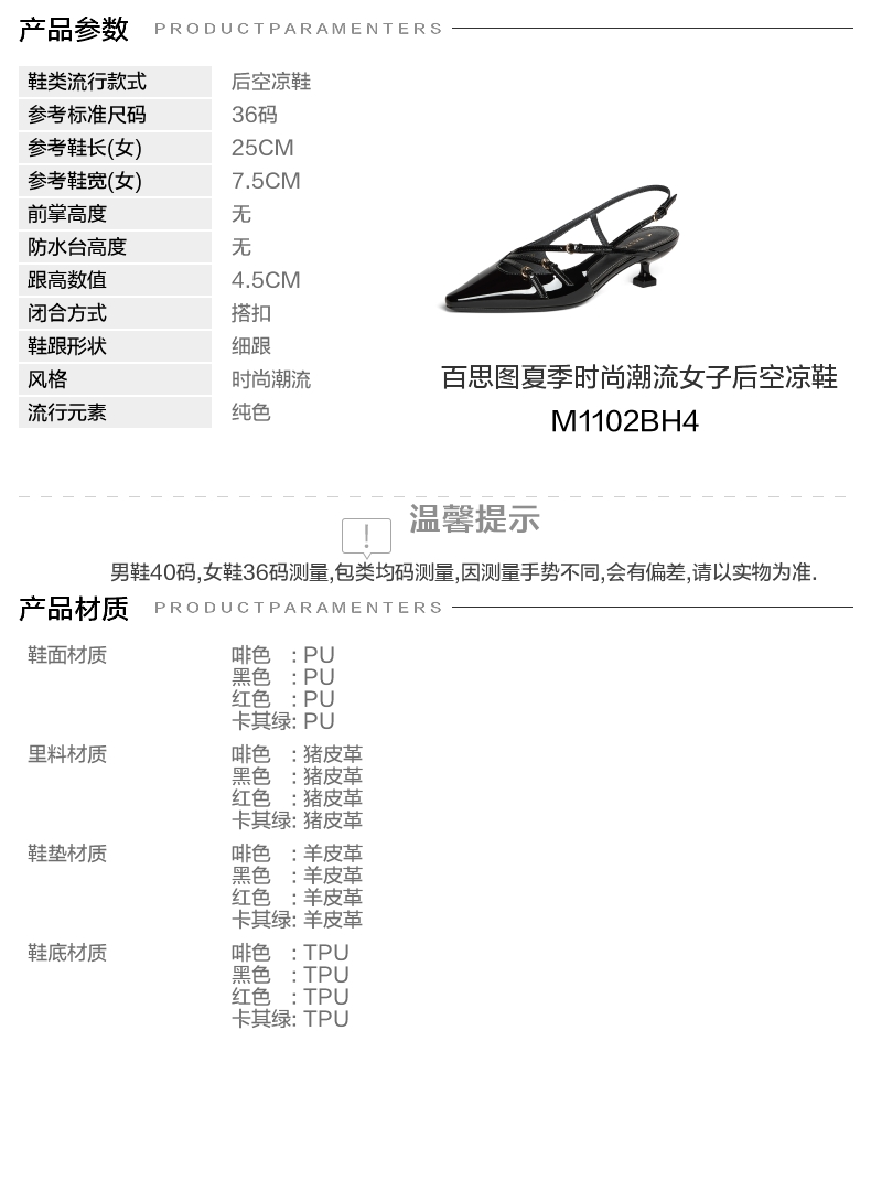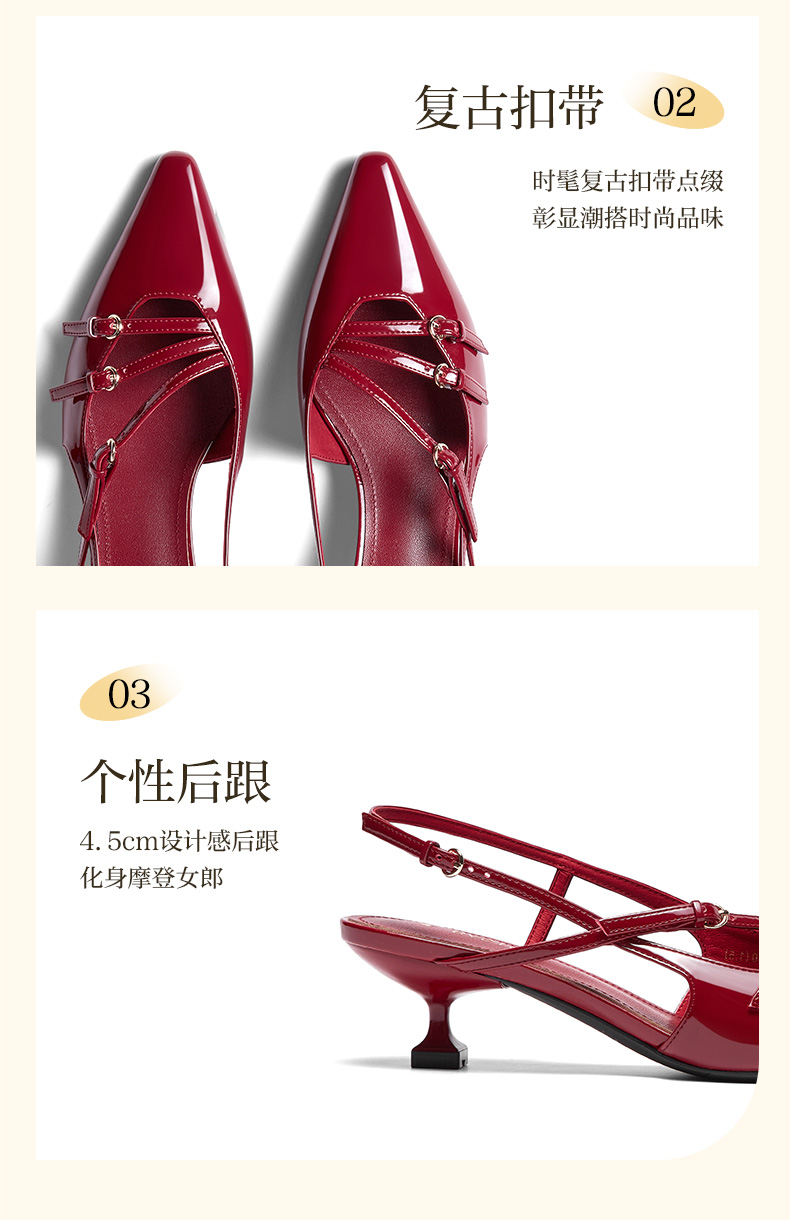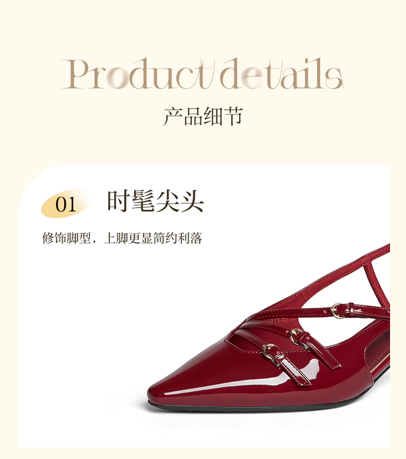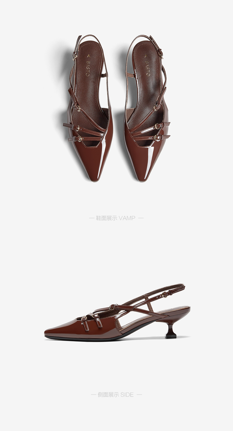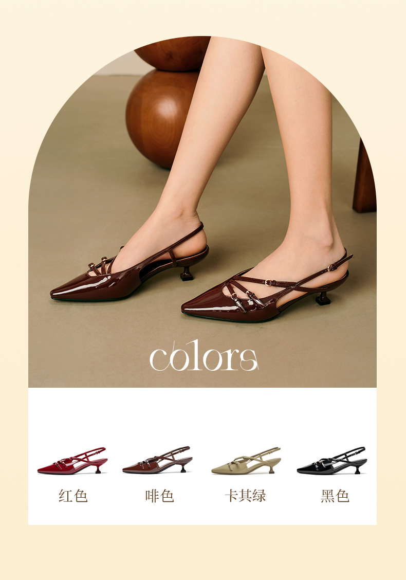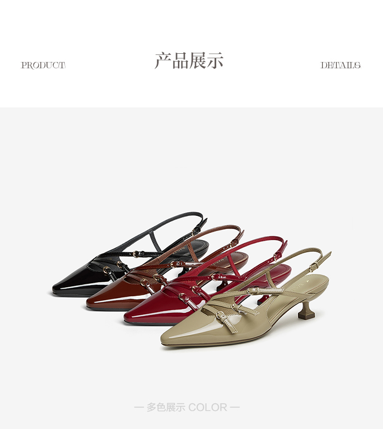| 鞋类流行款式:后空凉鞋后空凉鞋 | 鞋头款式:尖头尖头 | 执行标准:皮凉鞋GB/T22756-2017皮凉鞋GB/T22756-2017 | 跟高范围:中跟鞋(3-5CM)中跟鞋(3-5CM) | 鞋面图案:纯色纯色 |