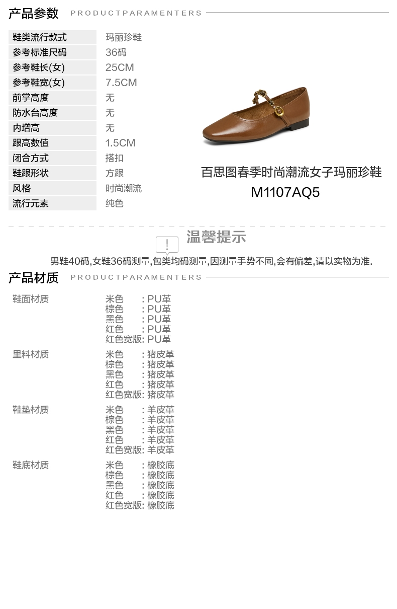 | 参考标准尺码:36码 | 跟高数值:1.5CM | 性别:女子 | 里料材质:猪皮革 | 制鞋工艺:胶贴皮鞋 |