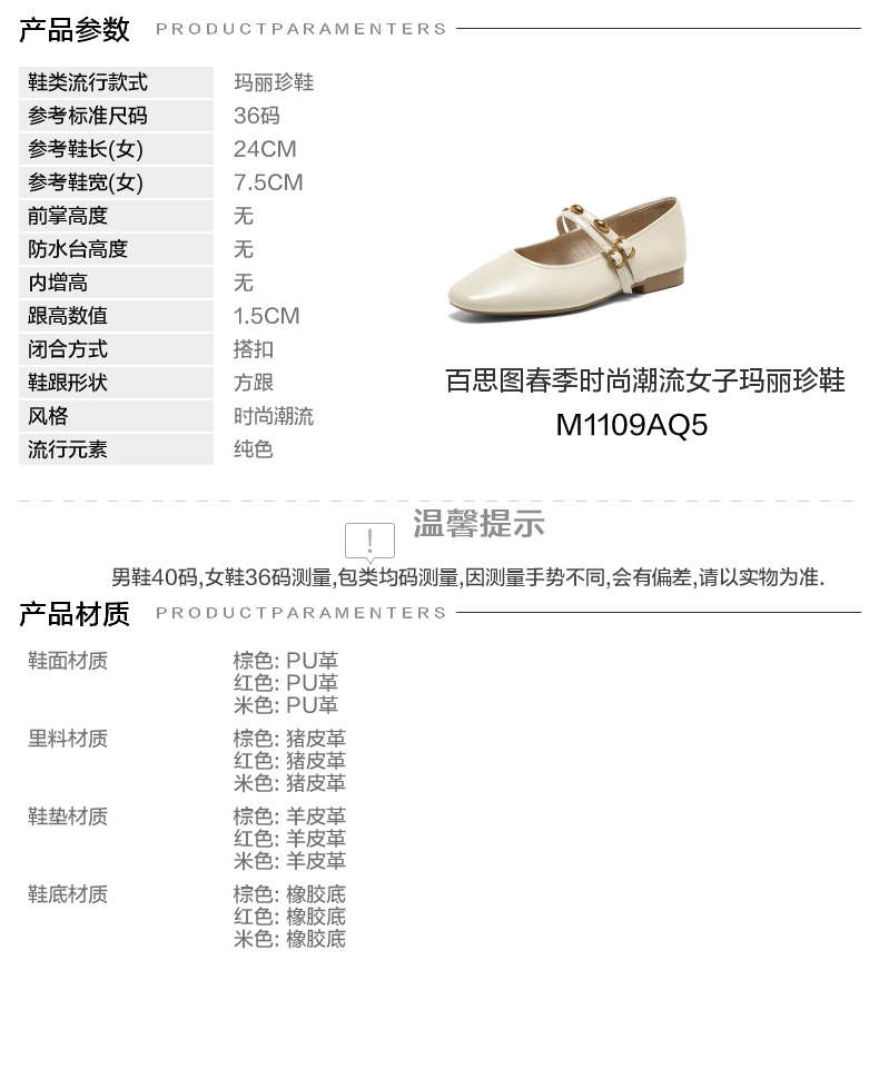 | 参考标准尺码:36码 | 跟高数值:1.5CM | 性别:女子 | 里料材质:猪皮革 | 制鞋工艺:胶贴皮鞋 |