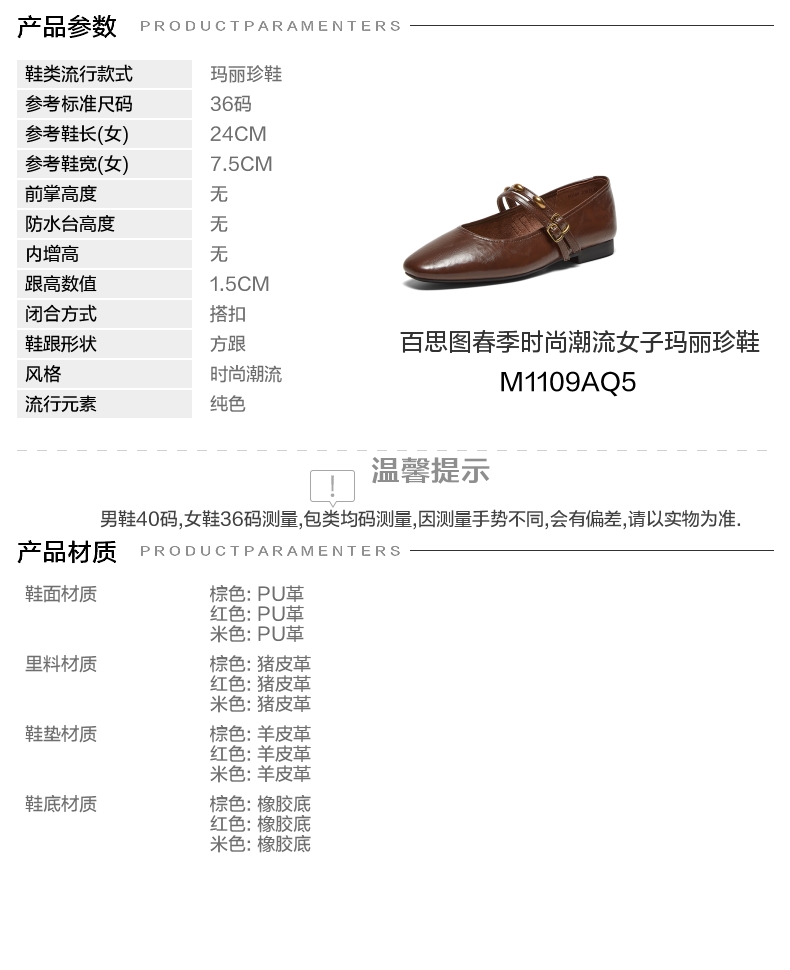 | 参考标准尺码:36码 | 跟高数值:1.5CM | 性别:女子 | 里料材质:猪皮革 | 制鞋工艺:胶贴皮鞋 |