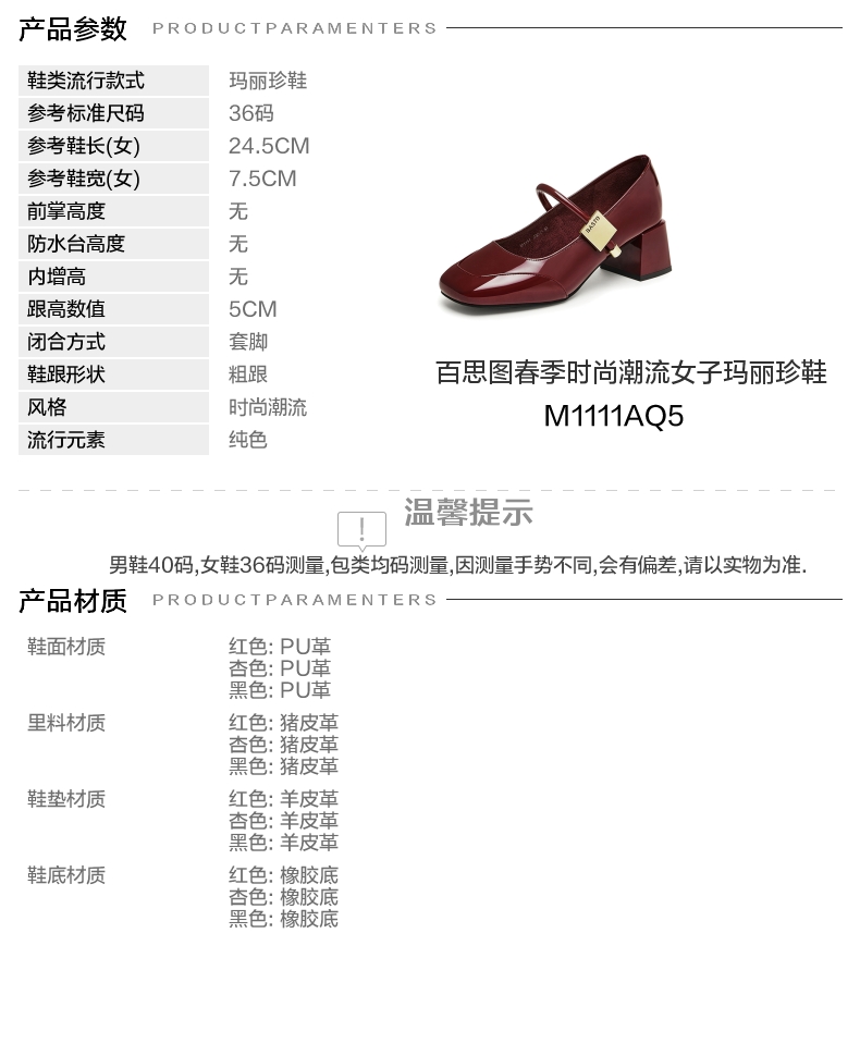 | 参考标准尺码:36码 | 跟高数值:5CM | 性别:女子 | 里料材质:猪皮革 | 制鞋工艺:胶贴皮鞋 |