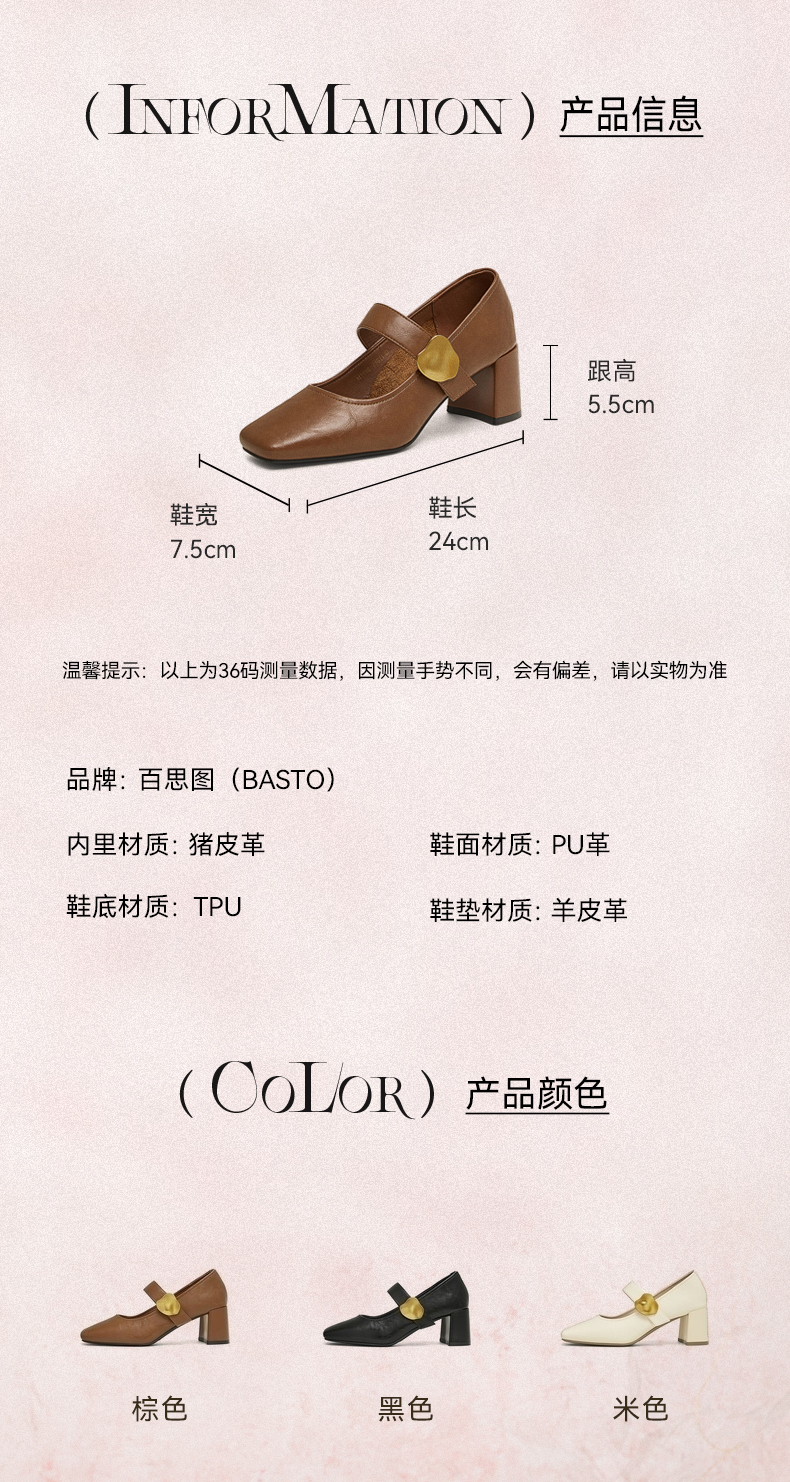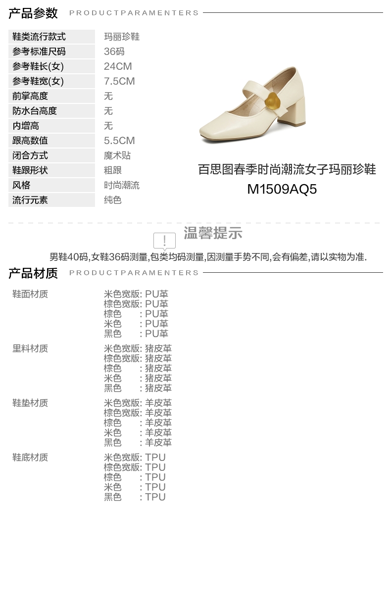 | 参考标准尺码:36码 | 跟高数值:5.5CM | 性别:女子 | 里料材质:猪皮革 | 制鞋工艺:胶贴皮鞋 |