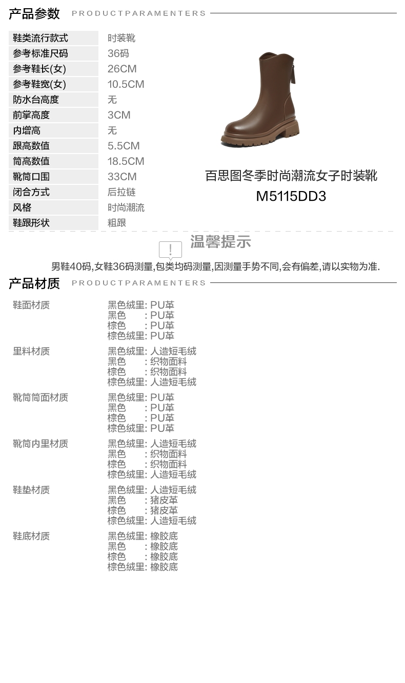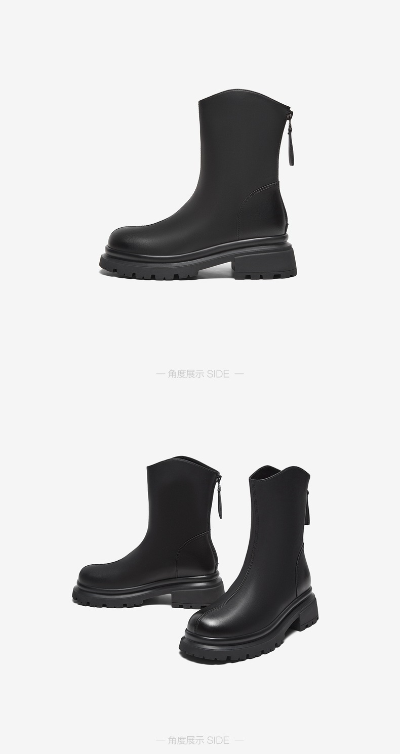 | 鞋类流行款式:时装靴 | 鞋头款式:圆头 | 执行标准:舒适上班鞋Q/LR001-2023 | 跟高范围:中跟鞋(3-5CM) | 鞋面图案:纯色 |