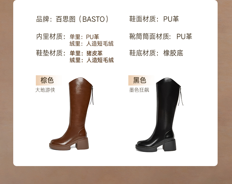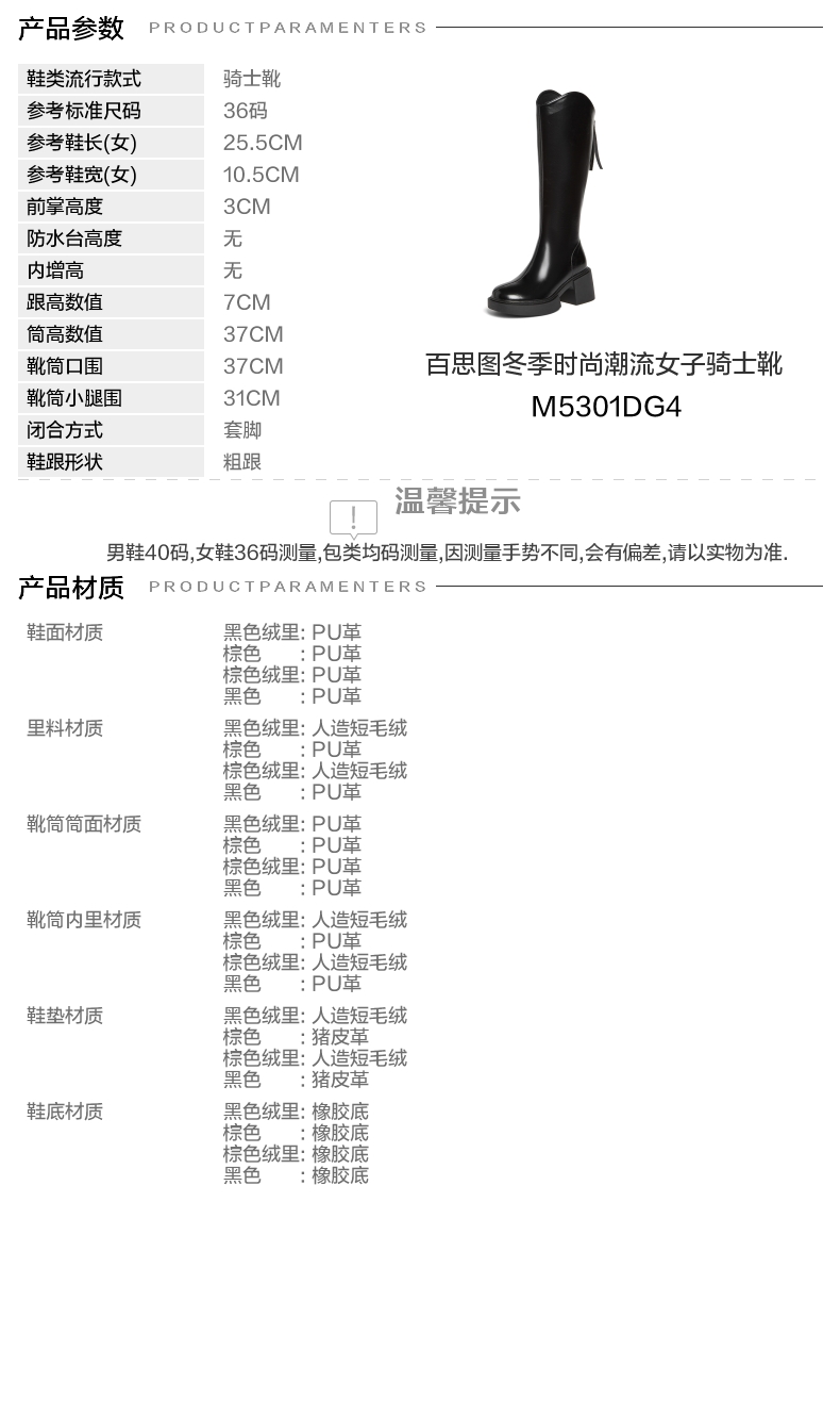 | 靴筒筒面材质:PU革 | 靴筒小腿围:31CM | 里料材质:人造短毛绒 | 制鞋工艺:胶贴皮鞋 | 鞋垫材质:人造短毛绒 |