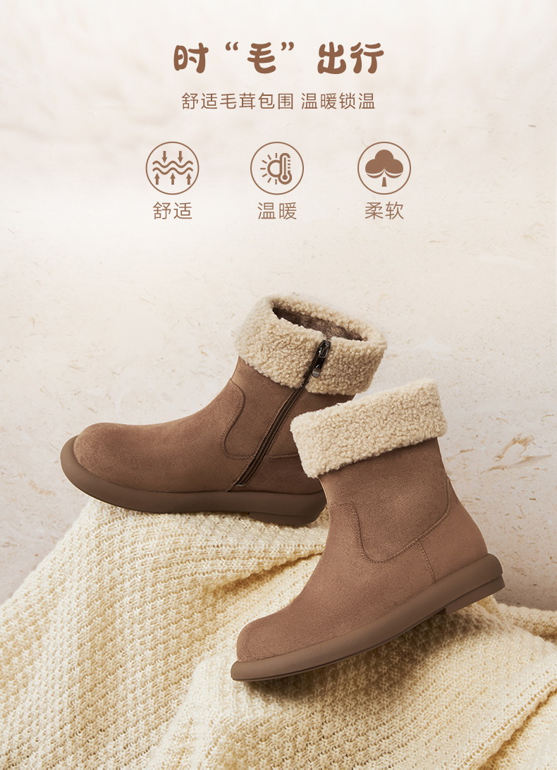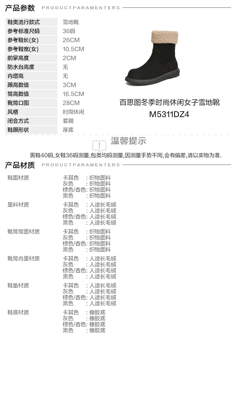| 功能科技:防滑 | 鞋底材质:橡胶底 | 靴筒内里材质:人造长毛绒 | 内增高:无 | 鞋面材质:织物面料 |