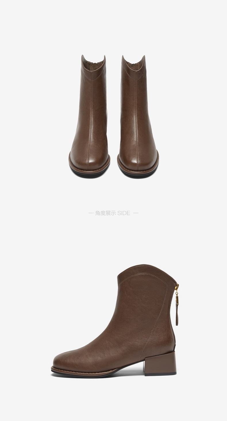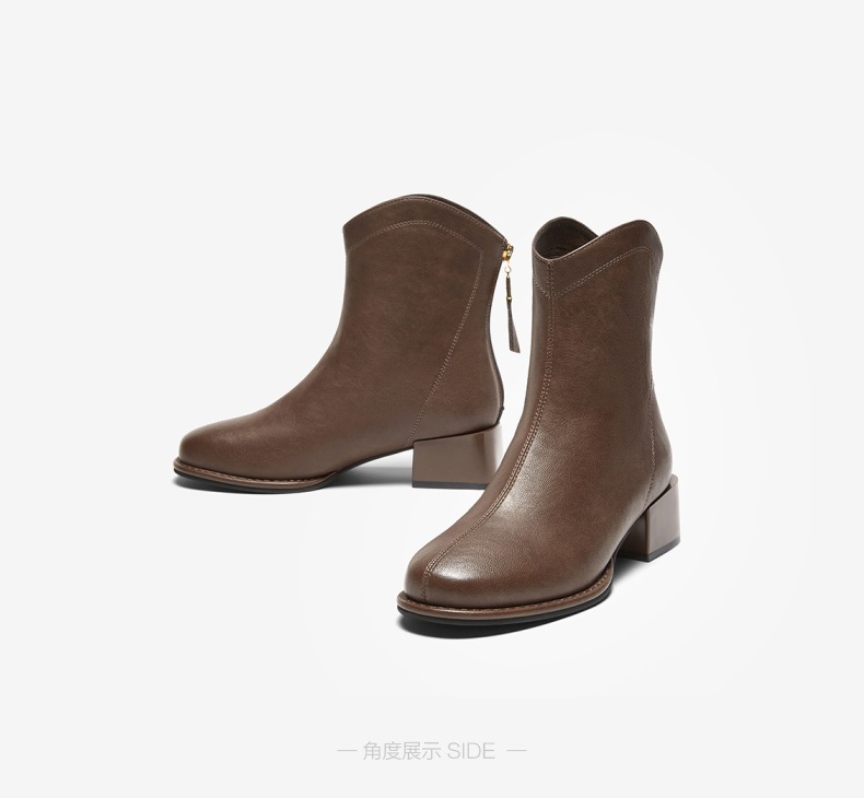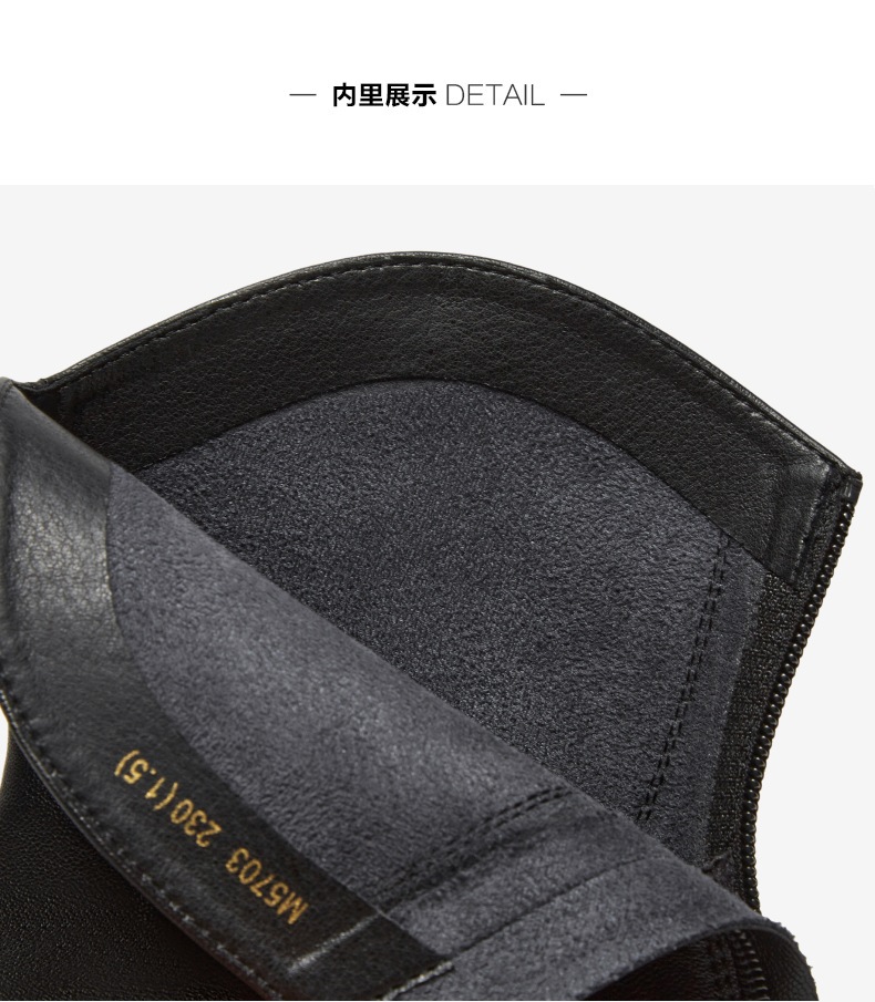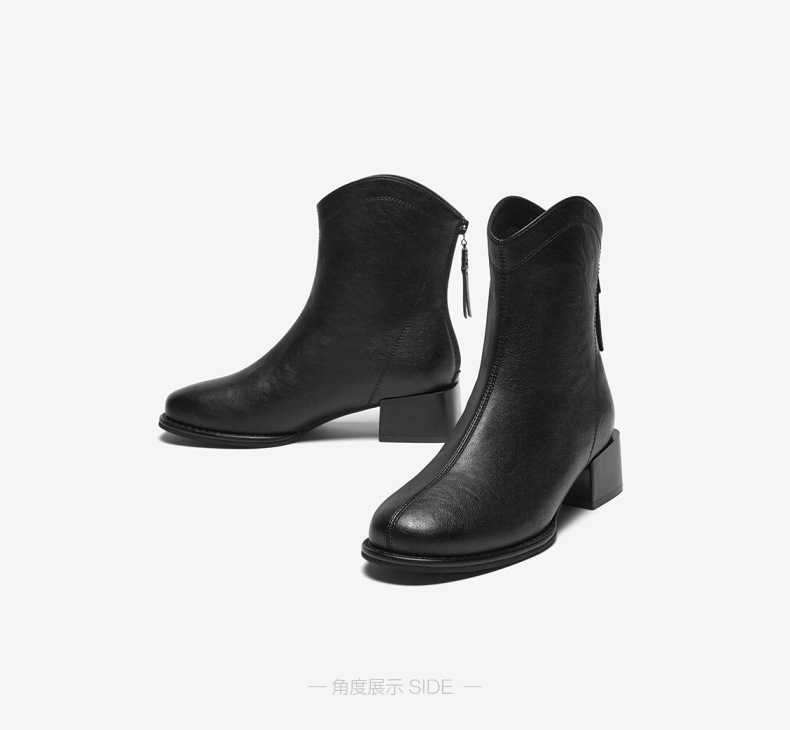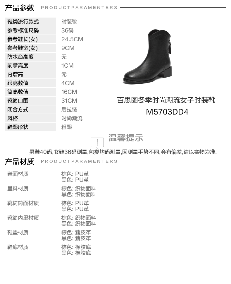 | 鞋类流行款式:时装靴 | 鞋头款式:圆头 | 执行标准:皮鞋 QB/T1002-2015 | 跟高范围:中跟鞋(3-5CM) | 鞋面图案:纯色 |