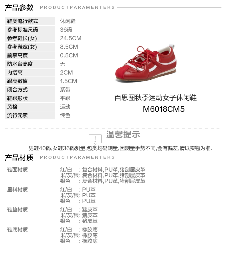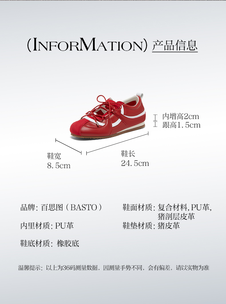 | 鞋帮:低帮 | 鞋底材质:橡胶底 | 内增高:2CM | 鞋面材质:猪剖层皮革PU革复合材料 | 闭合方式:系带 |