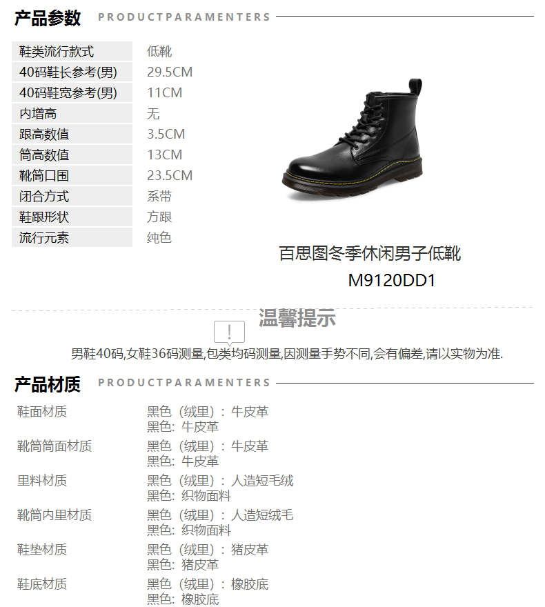 | 40码鞋长参考(男):29.5CM | 鞋底材质:橡胶底 | 靴筒内里材质:织物面料 | 内增高:无 | 鞋面材质:牛皮革 |