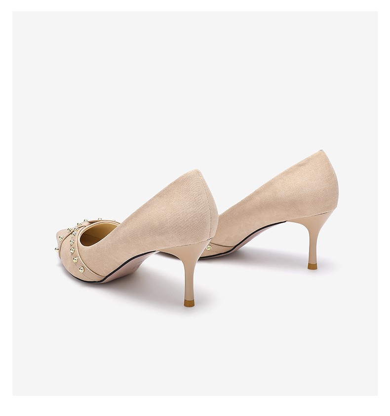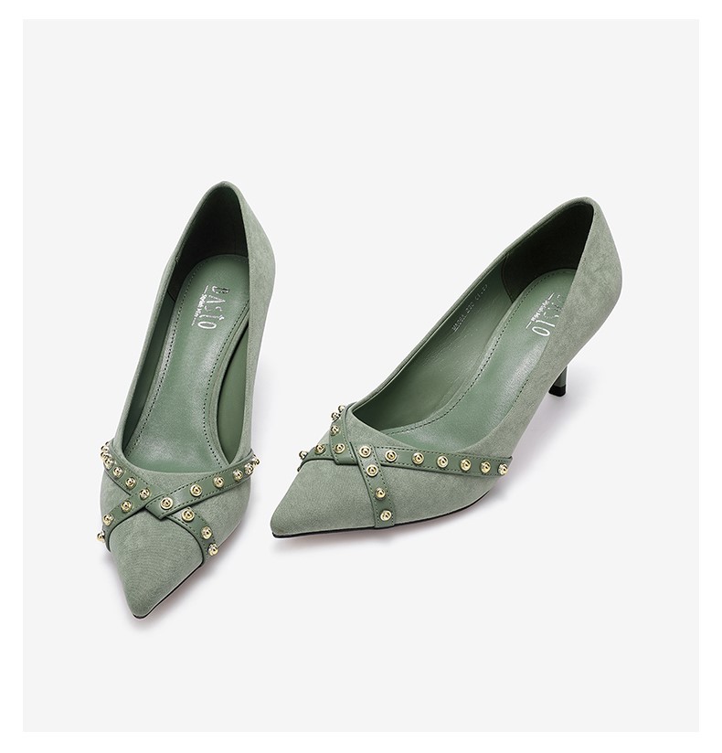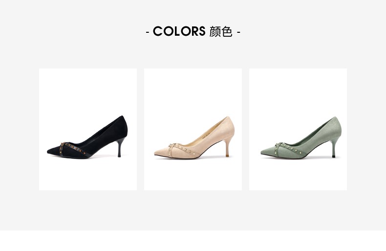 | 鞋头款式:尖头 | 鞋底材质:橡胶底 | 鞋面图案:纯色 | 内增高:无 | 鞋跟形状:细跟 |